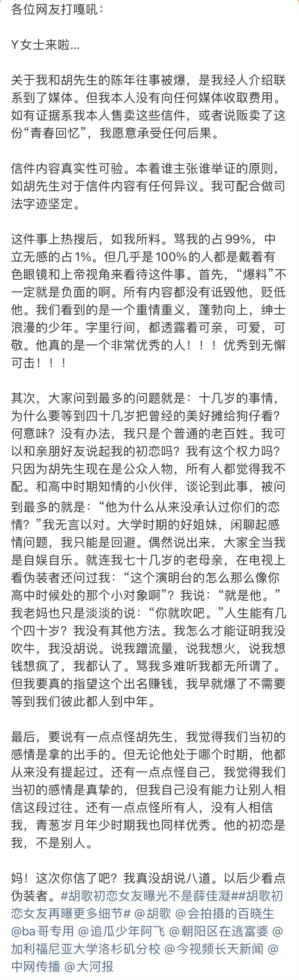 胡歌的初恋女友雪儿发文,简单来说就是她对外讨论这段感情,周围人都觉得她在吹牛,说出来就是为了证明自己真的和胡歌在一起过,从她的言语间似乎有点责怪胡歌,只因为对方没有承认这段恋情。