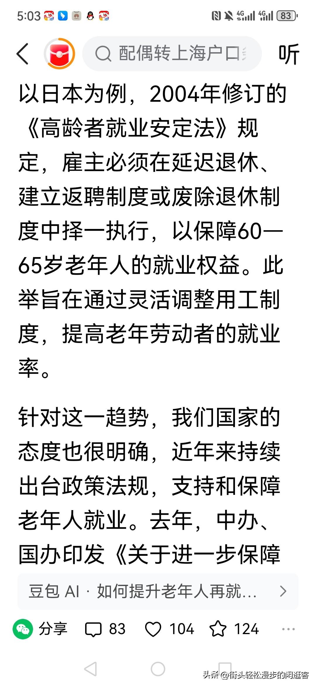 上海率先推出老年人再就业保障实施方案! 堪称全国首个“吃螃蟹”的城市! 方案中清晰明确了诸多保障老年人再就业权益的细则。 一方面,为老年人提供专业的职业技能培训, 依据他们的身体状况和过往工作经验, 开设手工制作、园艺养护、简单数据分析等课程,助其更好地适应新岗位需求。 另一方面,建立专门的老年再就业纠纷调解机制。 一旦老年人在工作中遇到薪资拖欠、不合理辞退等问题, 能通过便捷渠道进行申诉和解决。 此外,鼓励企业积极吸纳老年人就业, 给予一定的政策优惠和资金补贴。 这一方案的实施,不仅让老年人有机会发挥余热, 增加收入,充实生活, 也在一定程度上缓解了部分行业的用工荒问题。 相信后续会有更多城市借鉴上海经验, 使老年人再就业保障工作更为完善。 这是要向日本学习,让老年人活到老,干到老!