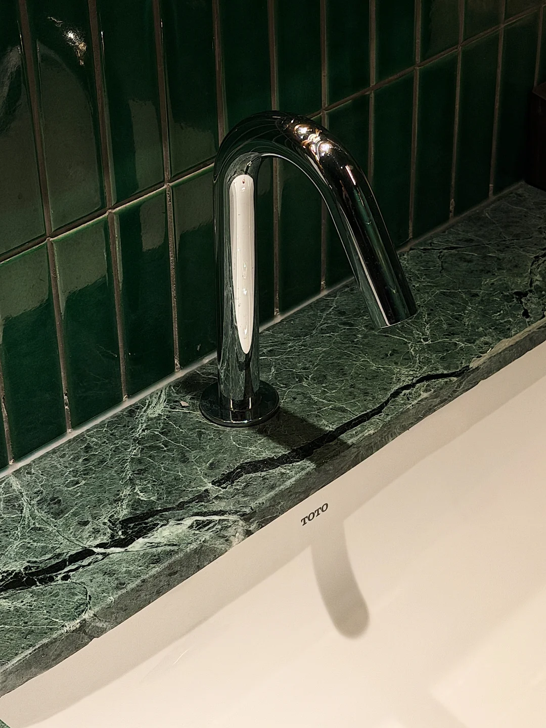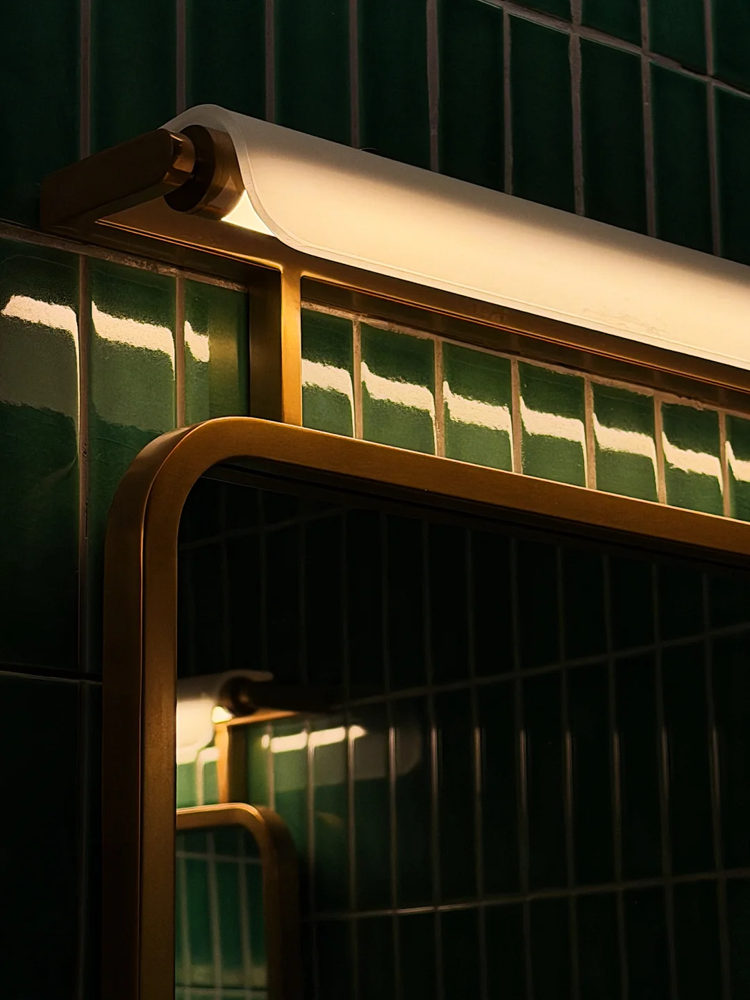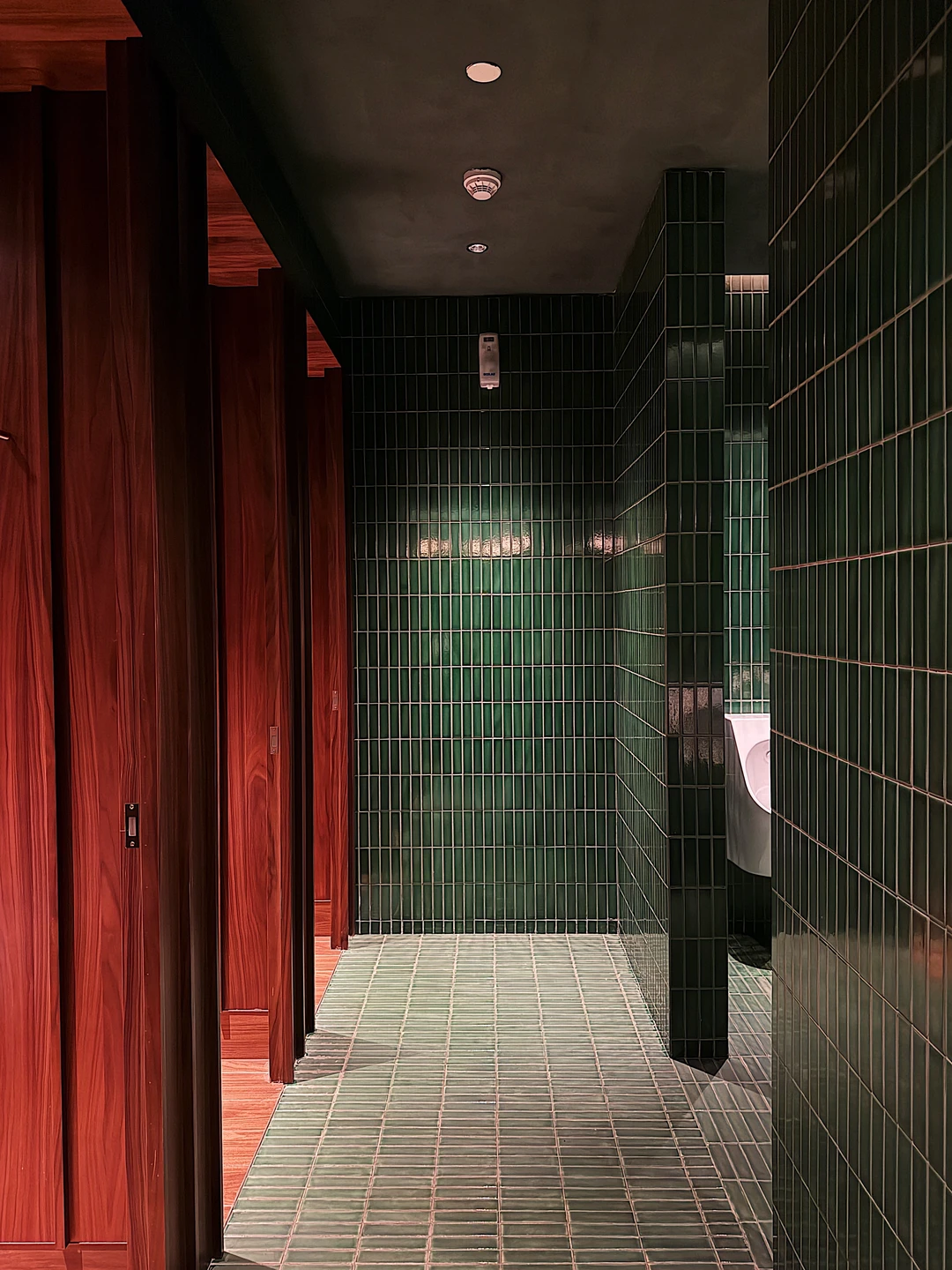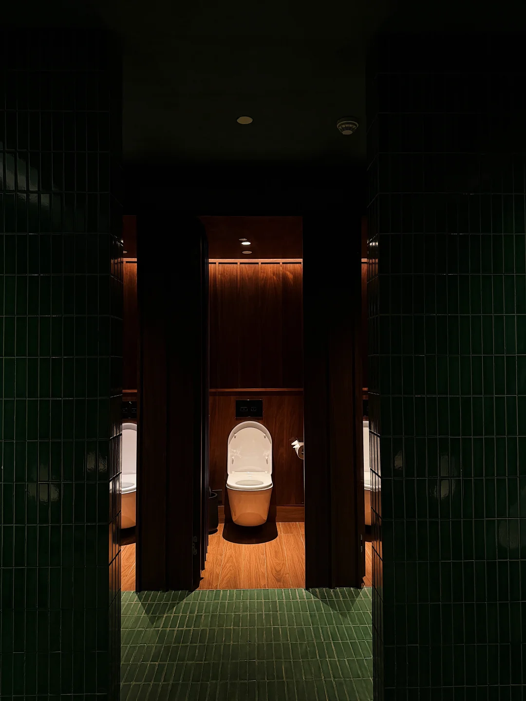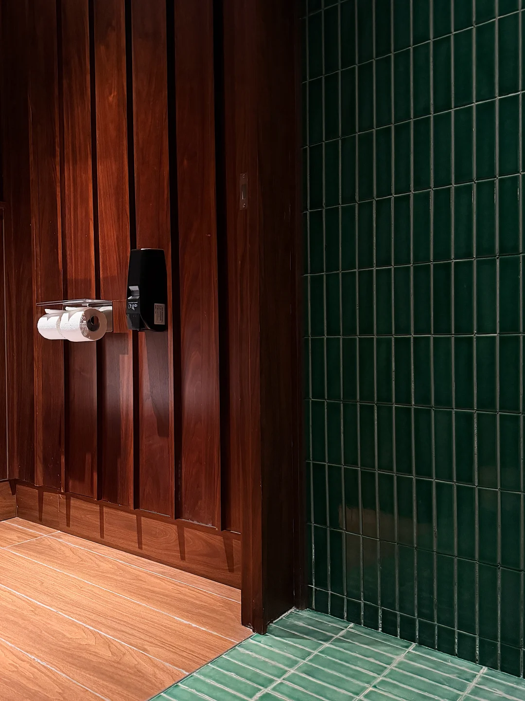 胡桃木与墨绿色窄条砖材搭配,既高级又复古,仔细看会发现地面与墙面运用了两种材料,地面为哑光砖材(包括马桶间地面砖材),而墙面则用了光泽度很好的材料,既兼顾实用也考虑了颜值,细节很在线。