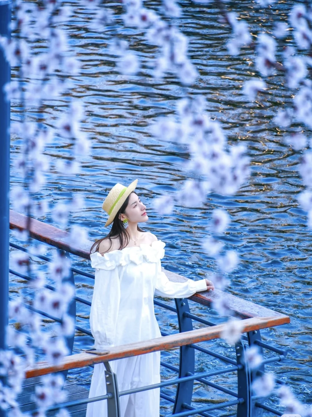 ✅机位②:亲水河堤处,人物从岸边高处用桃花做前景