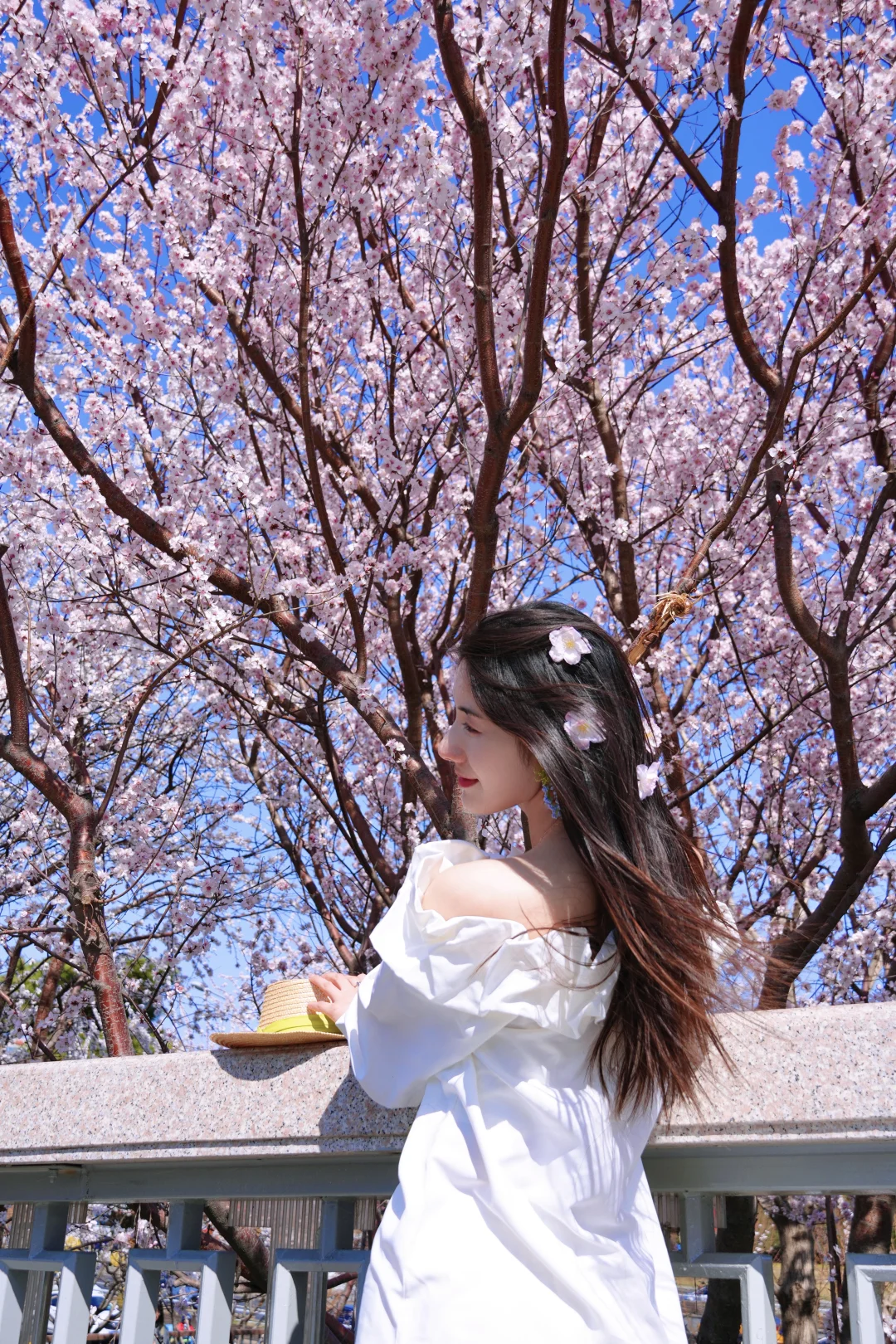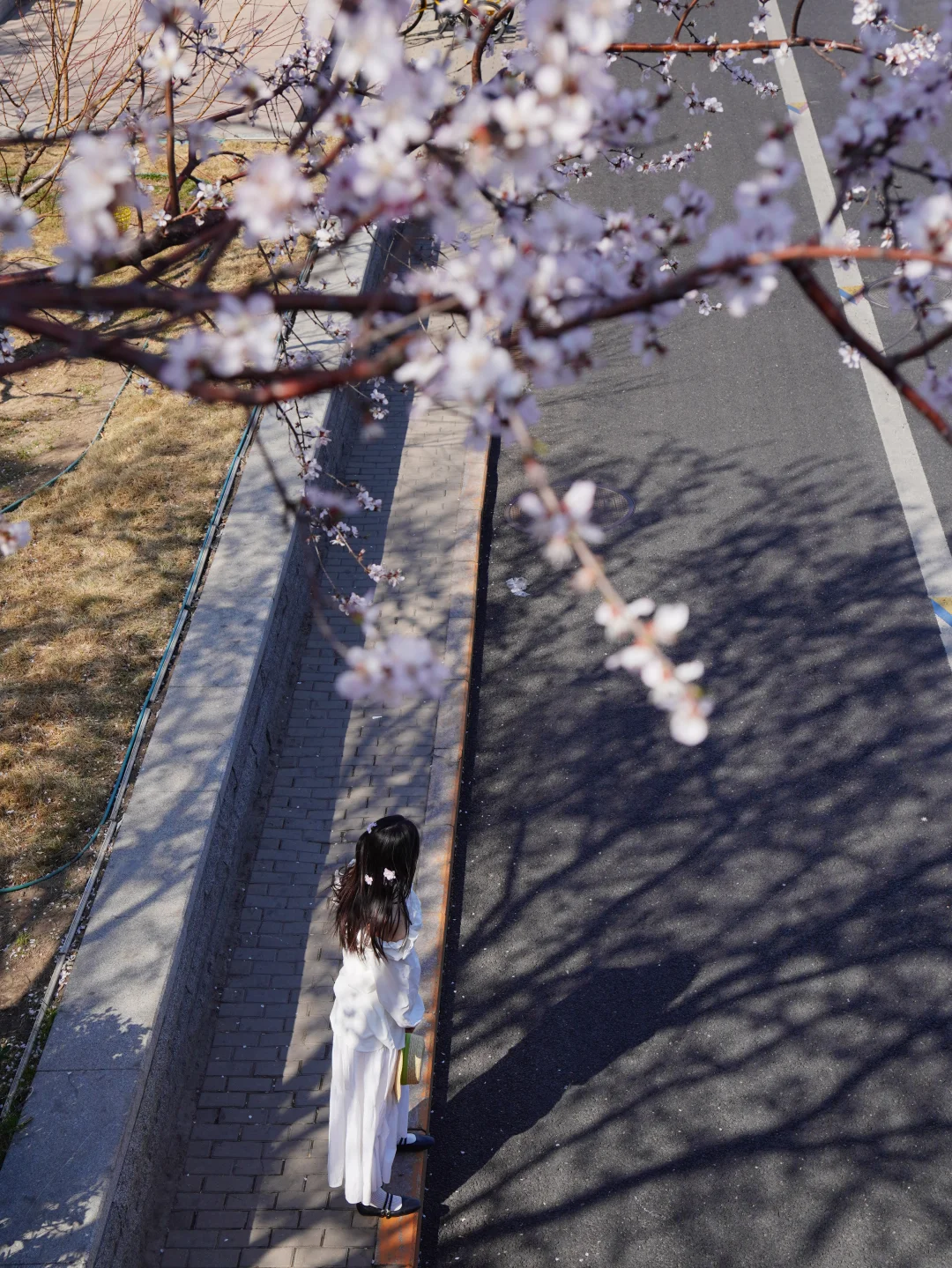 ✅机位②:人物站在天桥下,用桃花做前景俯拍