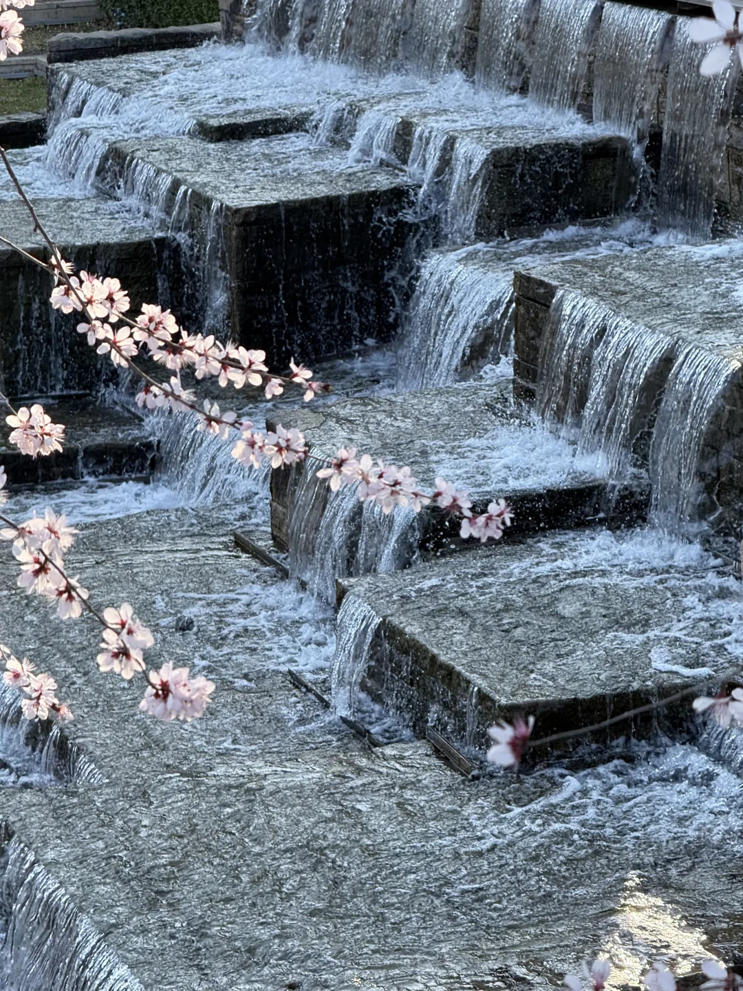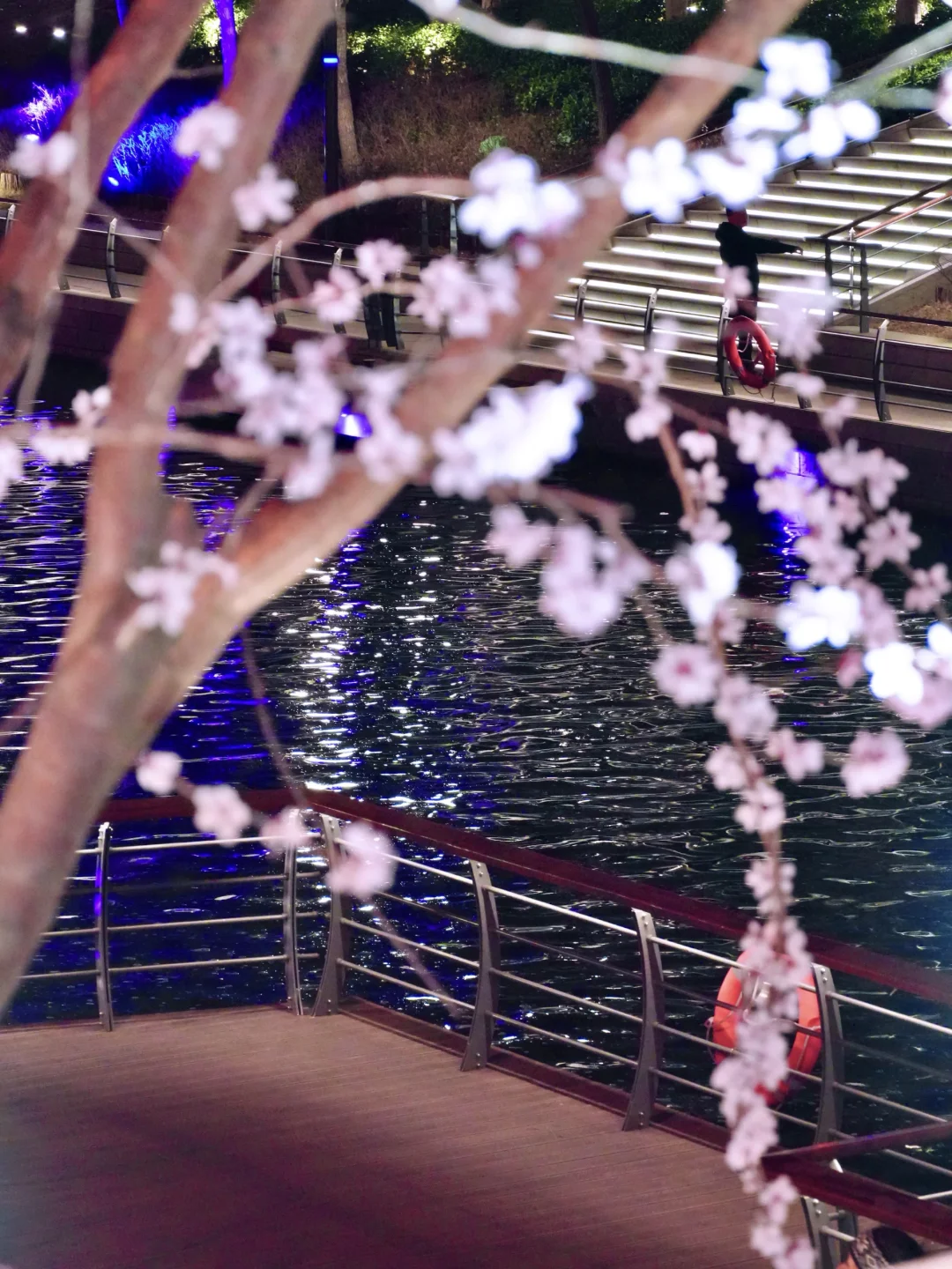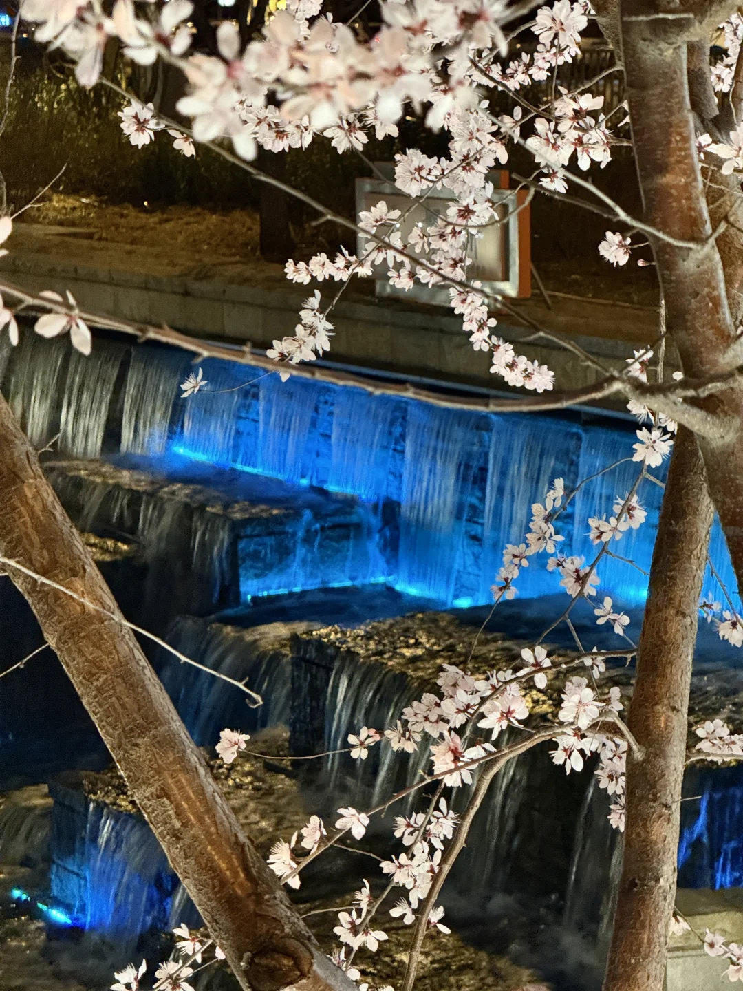 ✅机位①:亮马河公园路牌下方的人造瀑布,岸边桃花做前景