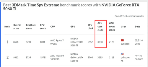与此同时,技嘉在甜品级市场也有亮眼表现。技嘉RTX5060Ti8G魔鹰显卡凭借卓越的超频潜力,在3DMarkTimeSpyExtreme基准测试中核心频率突破至3.33GHz,展现出强劲的超频能力。