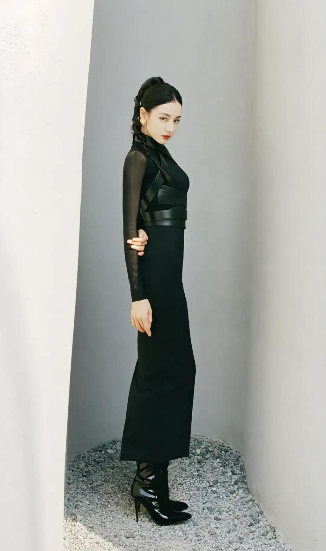 迪丽热巴黑丝长腿哑光黑丝勾勒优越腿型,牛仔大衣碰撞慵懒魅惑,生图里的迪丽热巴冷艳