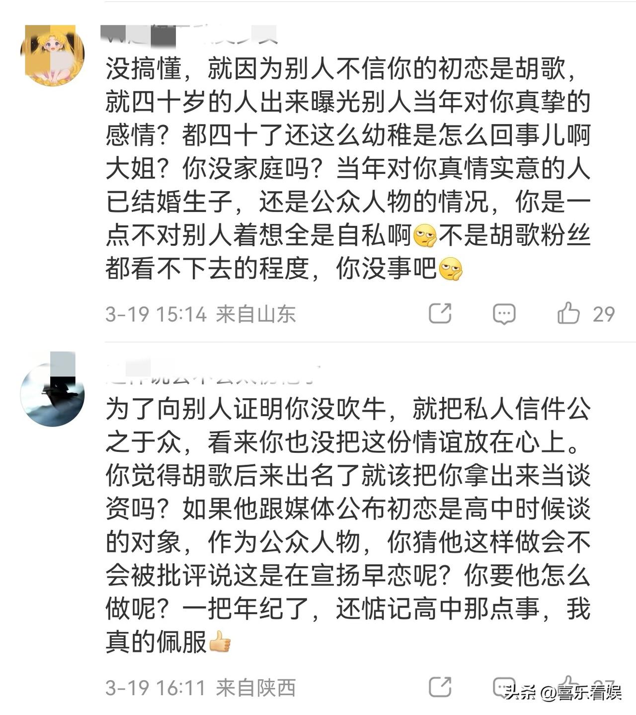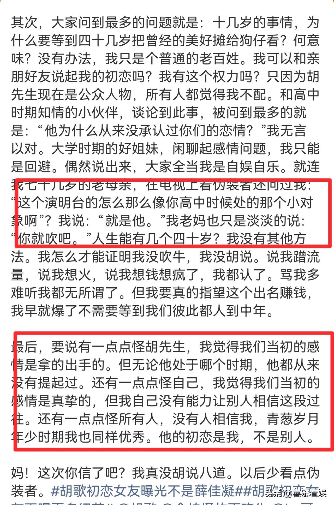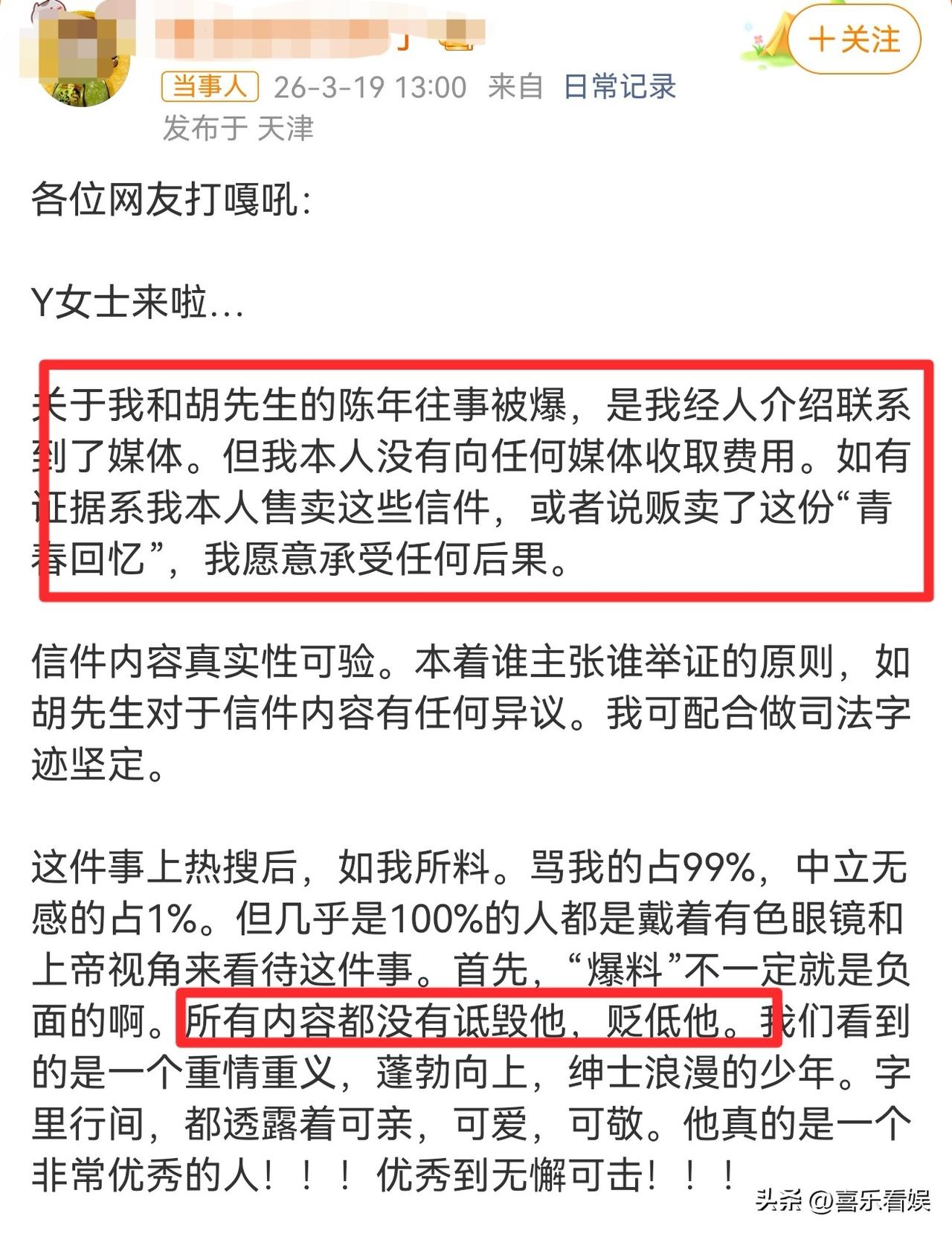 胡歌的初恋,亲自发文! 3月19日下午,胡歌的初恋女友亲自在社交平台上发布了一篇长文,把信件曝光一事,说清楚了。 Y女士表示,自己是经人介绍联系媒体,没收钱,就是想把这事摊开说说,没有想蹭流量之意。 她还特意强调,所有爆料都没诋毁胡歌,只是想把当年的事讲清楚。 看她发的长文,真的挺感慨的。 她说大家都觉得她不配,因为胡歌是公众人物,而她只是普通人,在亲朋好友面前提起与胡歌当年的恋情,大家都不信她。 她还怪胡歌,当年那么好的感情,却从来没被提起过,甚至连她七十多岁的老妈在电视上看到胡歌,都能认出是她高中处的那个小对象。 不过网友的评论也挺真实的,有人说:“没搞懂,就因为别人不信,四十岁出来曝光别人感情?” 还有人觉得:“为了证明自己没吹牛,把私人信件公开,也没把这份情谊放在心上。” 确实,都过去二十多年的事了,现在拿出来说,不管初衷是啥,在这个时间点,真的挺让人意外的。 当年的青涩初恋,放在心里当个回忆也挺好,现在摆到台面上,不怪大家会多想。 对此,大家怎么看?