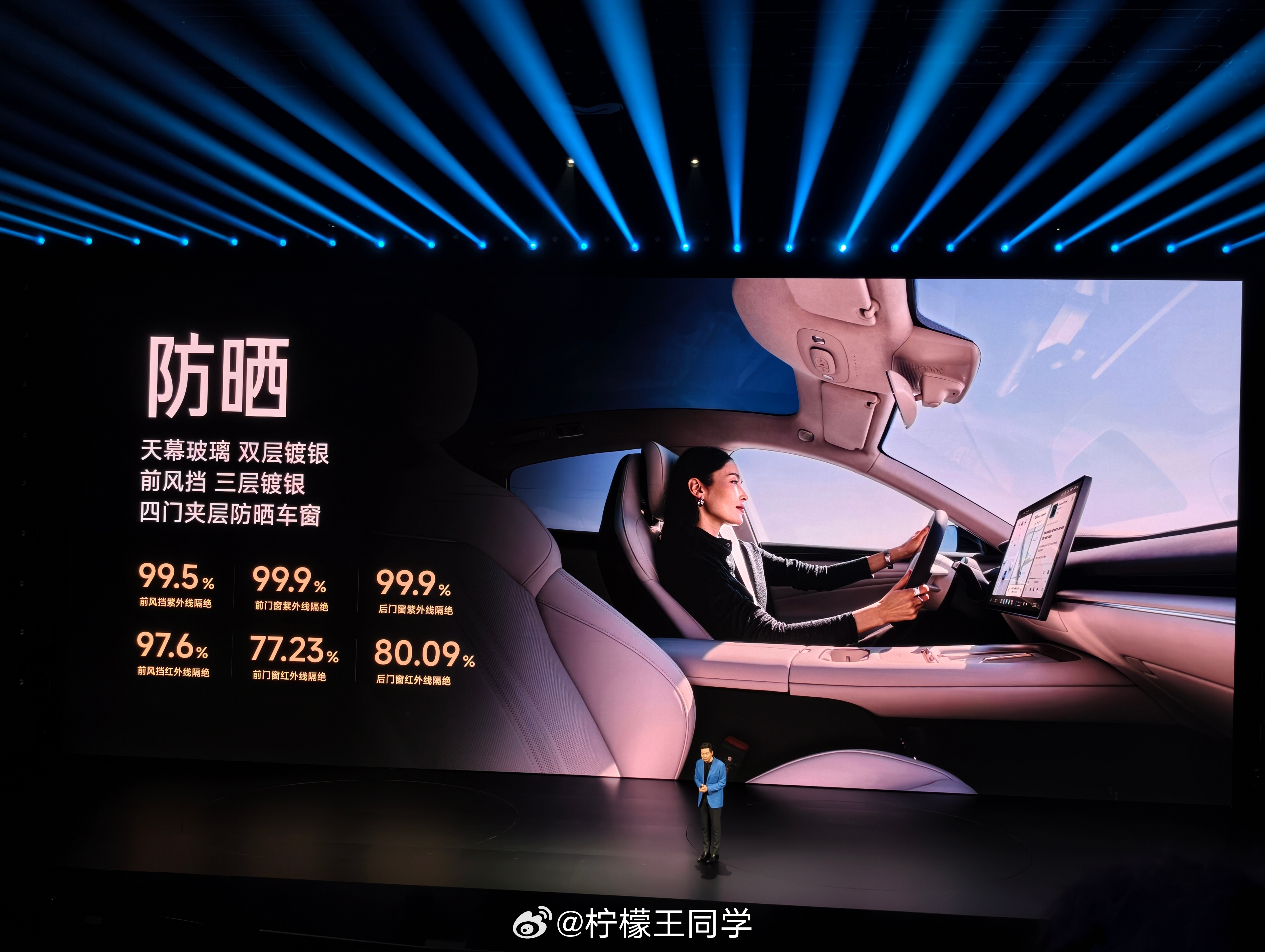 氛围灯也全面升级,一共四种内饰颜色,防晒也全面升级,车顶做了双分区变色玻璃调节,速度更快、实用场景更多