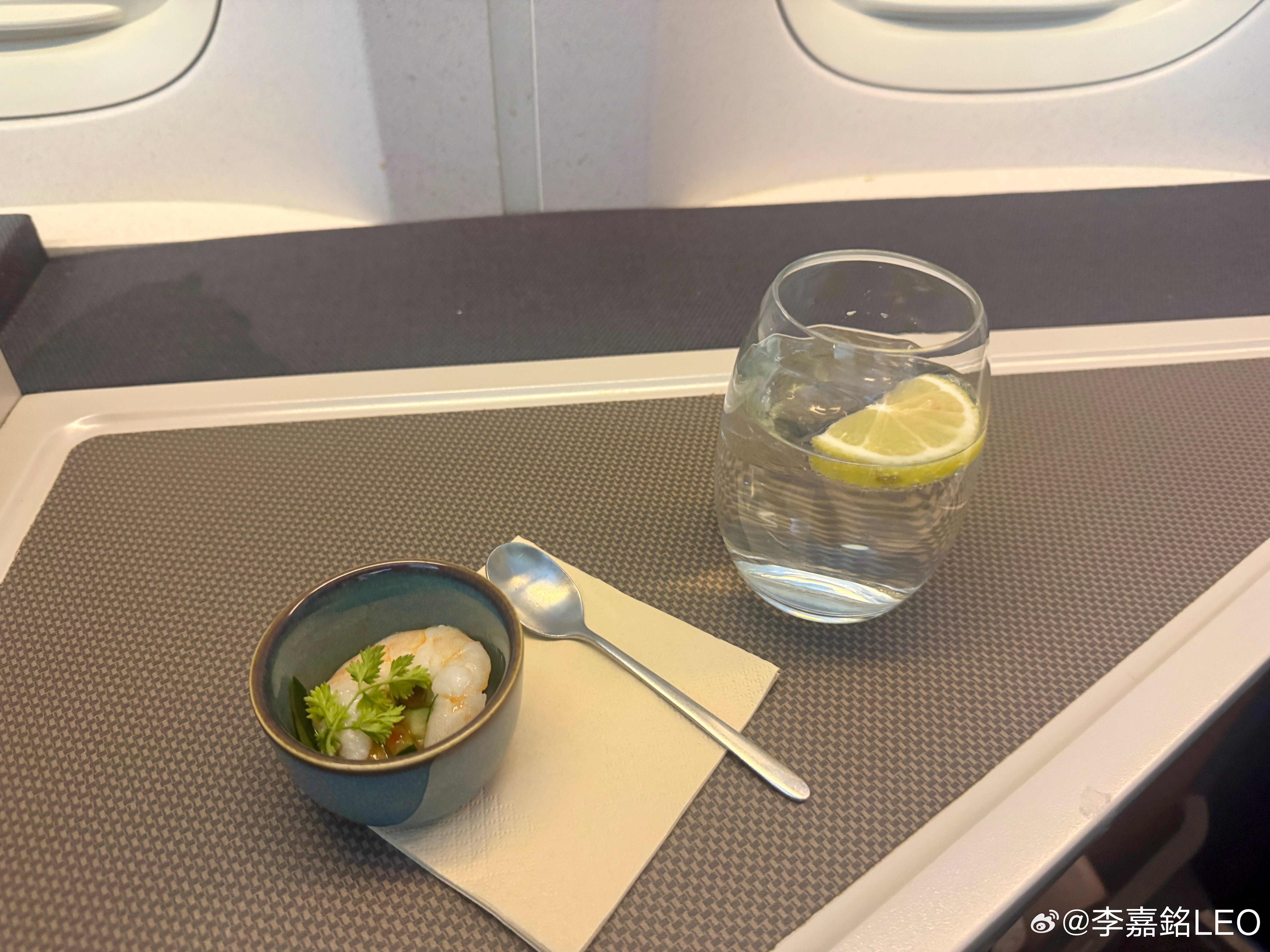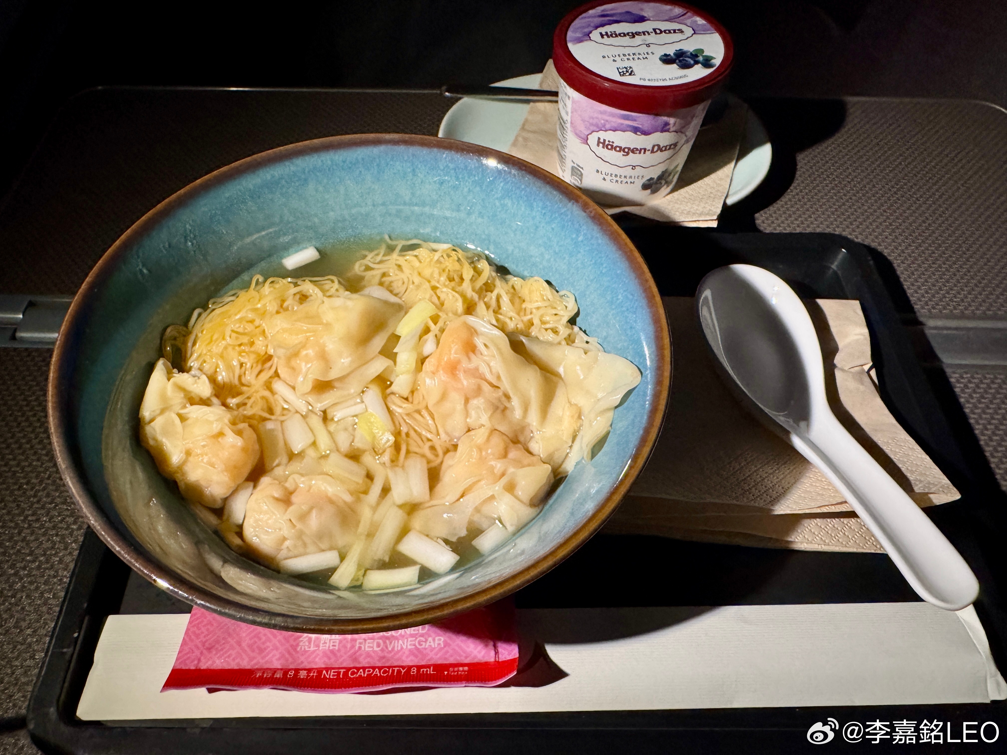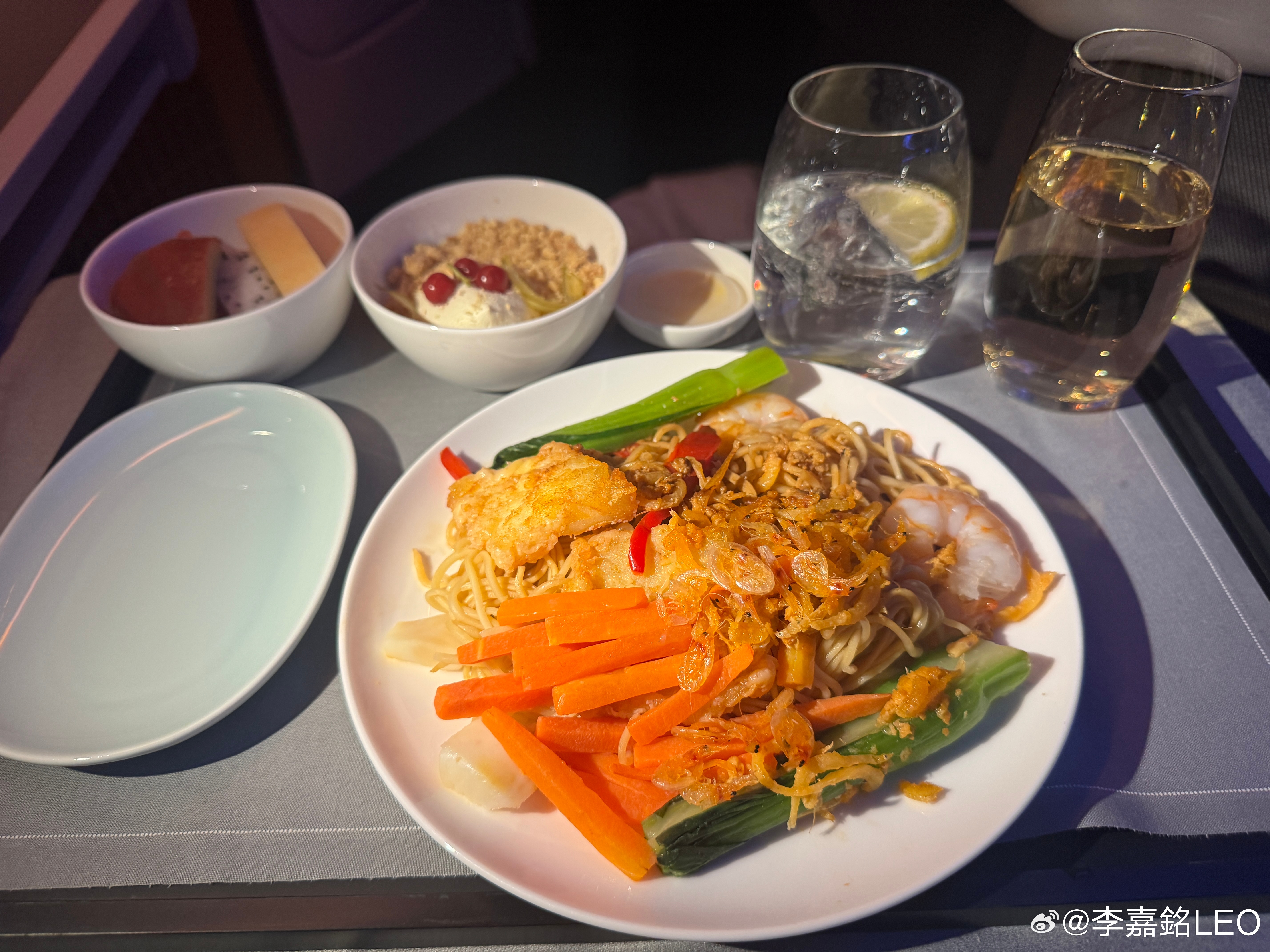 本来明年新会员制度,有2400分的冲刺任务下,是想买F,但整架飞机从头等到经济舱全部满员,还超售了一些位置,能候补到位置已经相当幸运。⸻💺 客舱本次执飞为 波音 777-300ER,带头等四舱机型,航程超过 14 小时,算是国泰比较典型的一条超长航线。商务舱满员,登机之后明显能感觉到客舱节奏比平时更忙碌。不过在服务开始后,乘务组依然保持着比较稳定的节奏。睡眠方面,商务舱提供 床垫,不过需要 自己铺设。铺上之后平躺舒适度会明显提升,在超过 14 小时的航程里,有一段完整睡眠还是非常重要的。⸻🍽️ 餐食本次航班提供 三顿主食供应。第一顿(起飞后)登机前通过在线预订了 龙虾汤泡饭。龙虾汤底鲜味比较明显,带一点海鲜甜味,泡饭口感顺滑。虽然谈不上特别惊艳,但属于 稳妥、不容易出错的选择。⸻🍜中段轻食飞行途中点了一份 麦奀记云吞面。这道其实算是本次航班的 最大亮点。虽然没有地面店里现煮的那种弹牙口感,但在万米高空能吃到一碗: • 汤底香气明显 • 云吞虾味足 • 面条也没有过度软烂在长途航班中段来一碗热汤面,体验确实很舒服。⸻落地前一餐最后一顿空姐推荐了 樱花虾海鲜炒面。整体是比较清爽的风格: • 油不重 • 海鲜味道自然 • 樱花虾作为点缀很香作为长途航班的收尾餐来说,不会太负担。⸻✈️ 小结在这次 欧洲机票极度紧张、全舱满载 的情况下,CX253 依然维持住了比较稳定的商务舱水准。有些时候,长途飞行不会想要太多惊喜,但是保持水准就是一种很好的体验。
