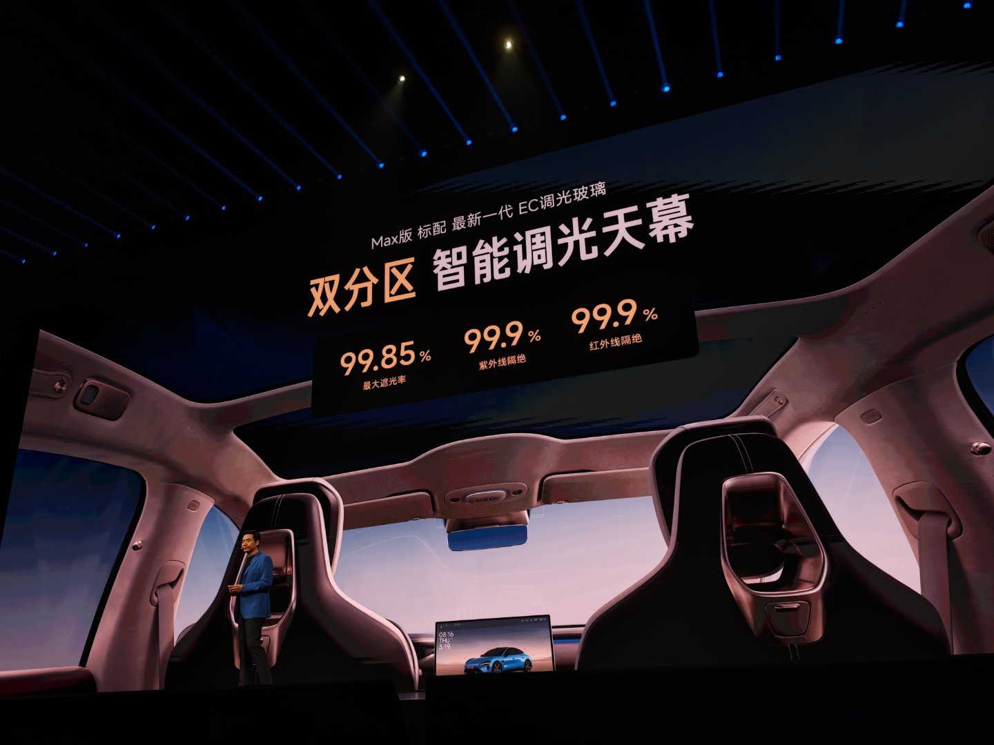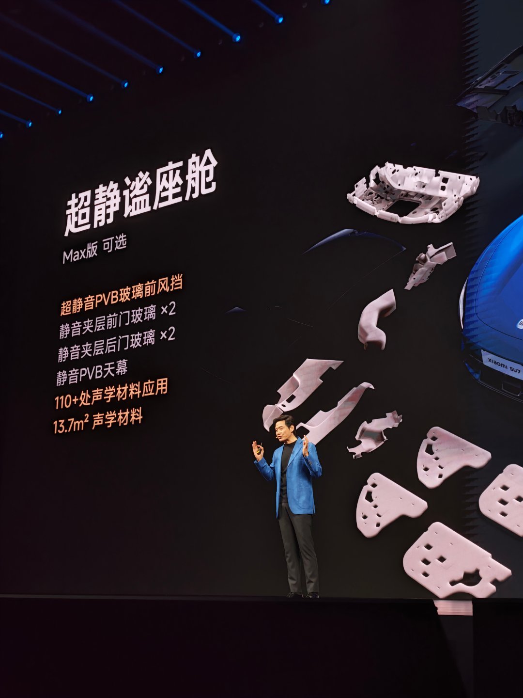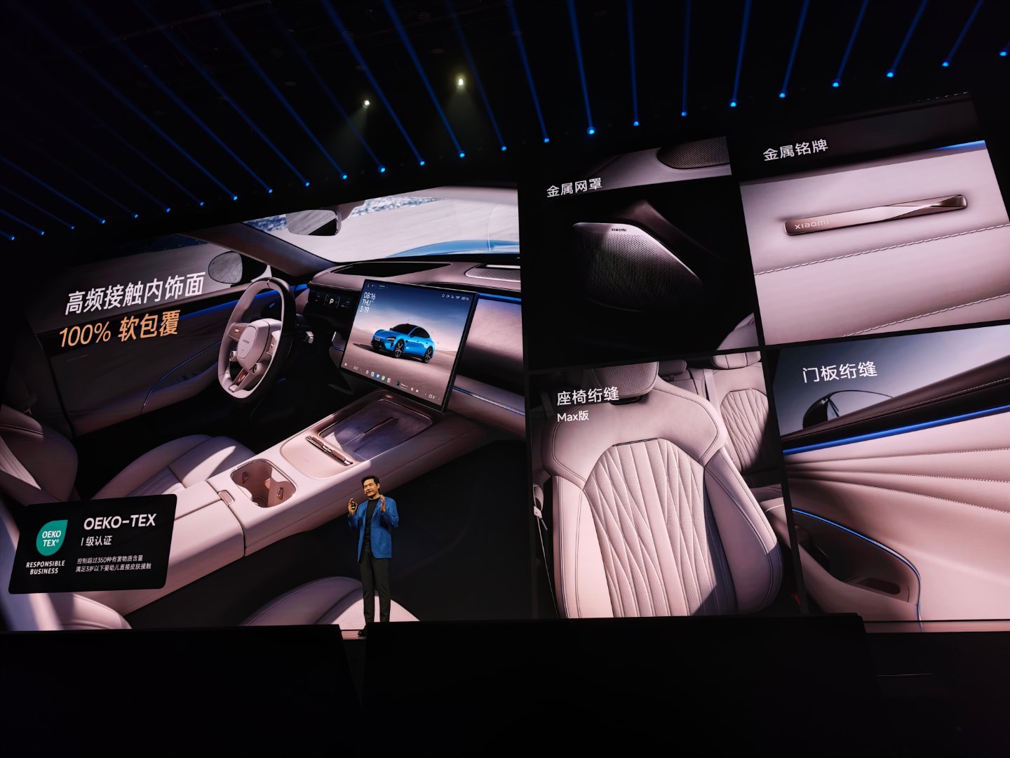 新一代SU7在内饰上的主要升级:全系标配18向可调运动座椅,支持侧翼支撑,副驾零重力座椅;三层环绕式氛围灯,高频接触内饰面100% 软包覆;全系标配四门静音夹胶玻璃,Max版可选超静谧座舱;Max版标配双分区智能调光天幕,前后排可独立调节。小米发布会