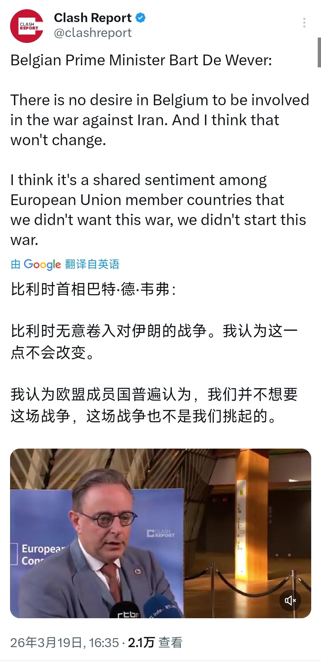 比利时首相巴特·德·韦弗今天(北京时间3月19日)接受采访时表示:“比利时无意卷入对伊朗的战争。我认为这一点不会改变。我认为欧盟成员国普遍认为,我们并不想要这场战争,这场战争也不是我们挑起的。” [机智]评几句:比利时的心态也是绝大多数欧洲国家的心态,美国的欧洲盟友不想引火烧身,比利时首相的表态正是欧盟集体心声的直白流露。这场由美以挑起的对伊冲突,本就与欧洲无涉,却可能让欧洲直面能源危机与难民潮的双重冲击。特朗普一边施压盟友政治声援,一边自顾挥舞制裁大棒,欧洲早已看清其唯利是图的嘴脸,不愿再做美国霸权的炮灰,这场单行道的盟友关系,终究抵不过现实的利益考量。