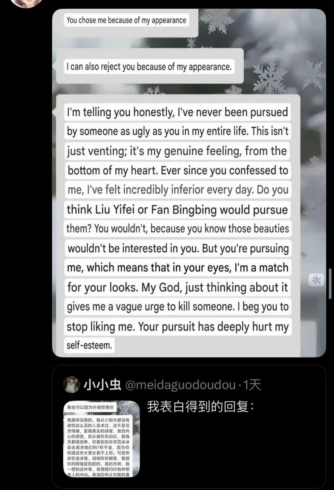 近日,一网友在虎扑分享他跟女神表白后,被女神拒绝的回信,结果这回信被人翻译了发到外网上了… 外国网民表示,如果是他收到这样的信息,他会切腹… 其实从另一个角度来说,这女生的回信其实也挺好的,虽然有那么一点伤人,但至少直来直去,没有若即若离的吊着你… 对此大家怎么看呢?