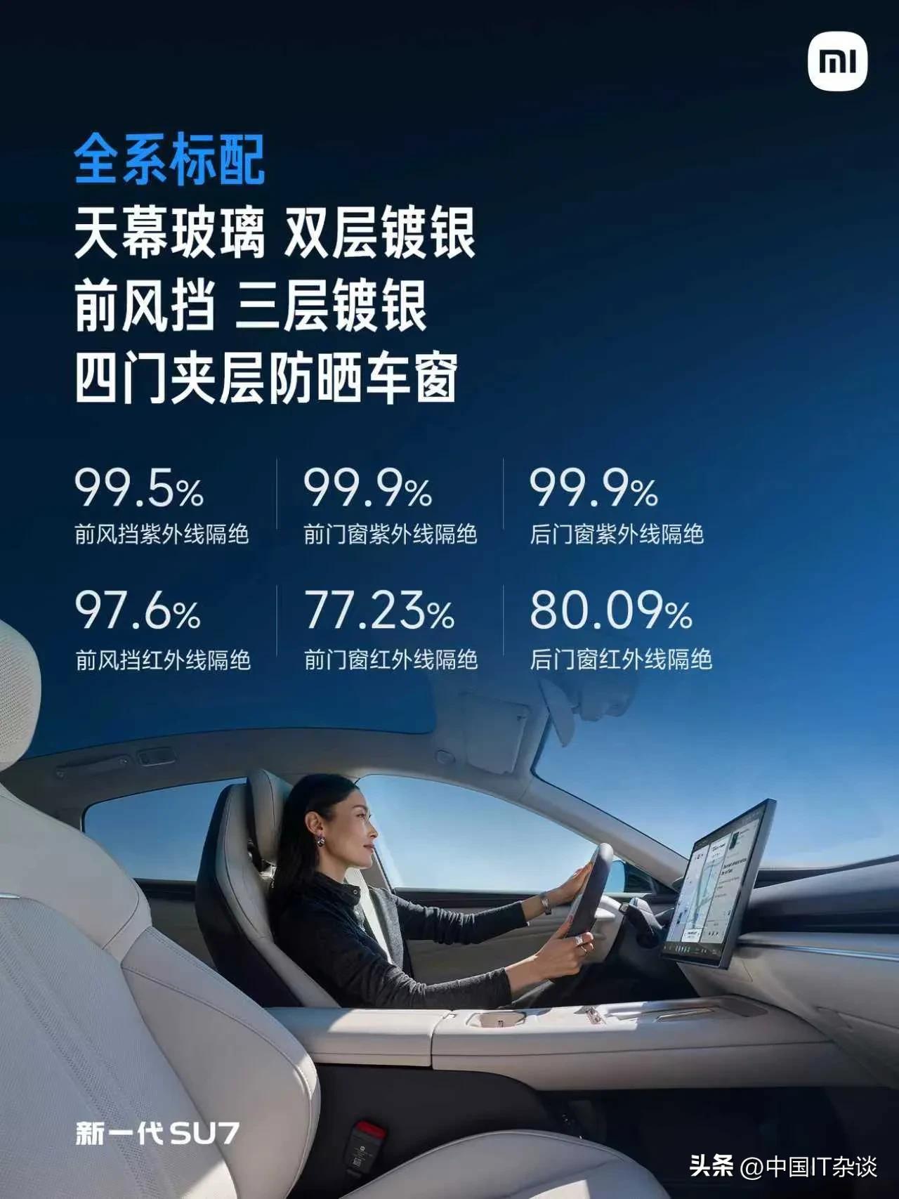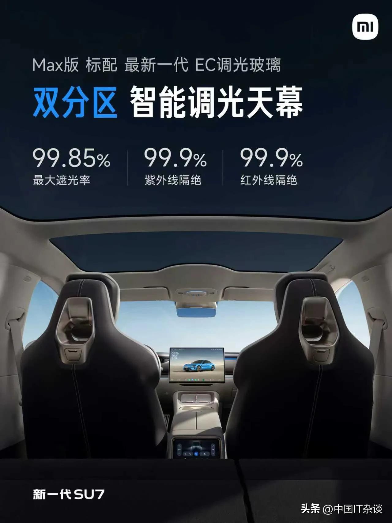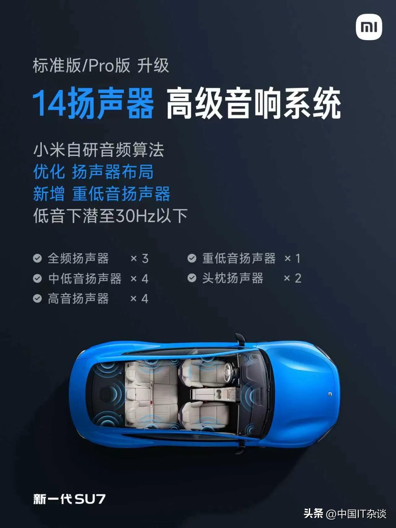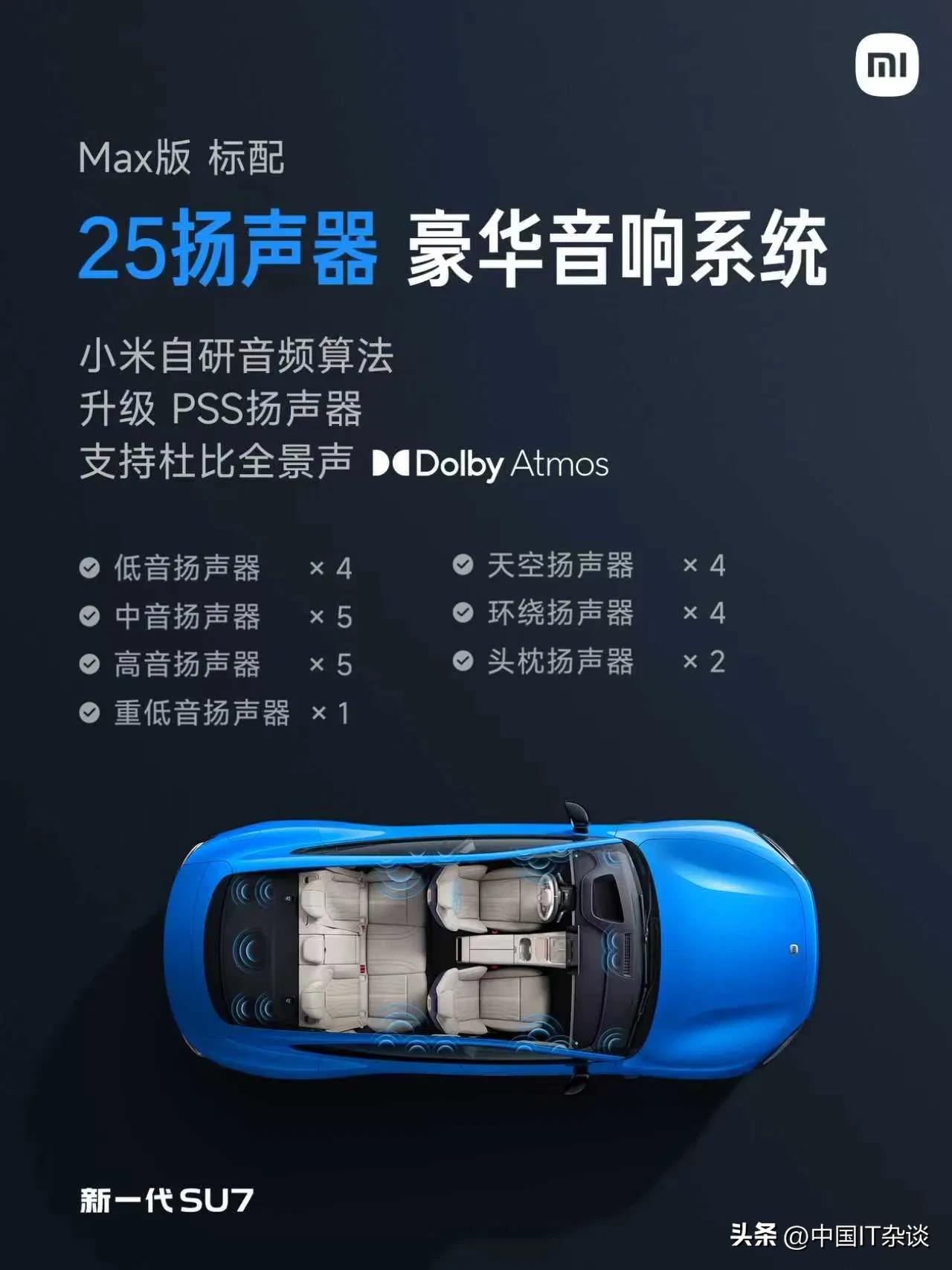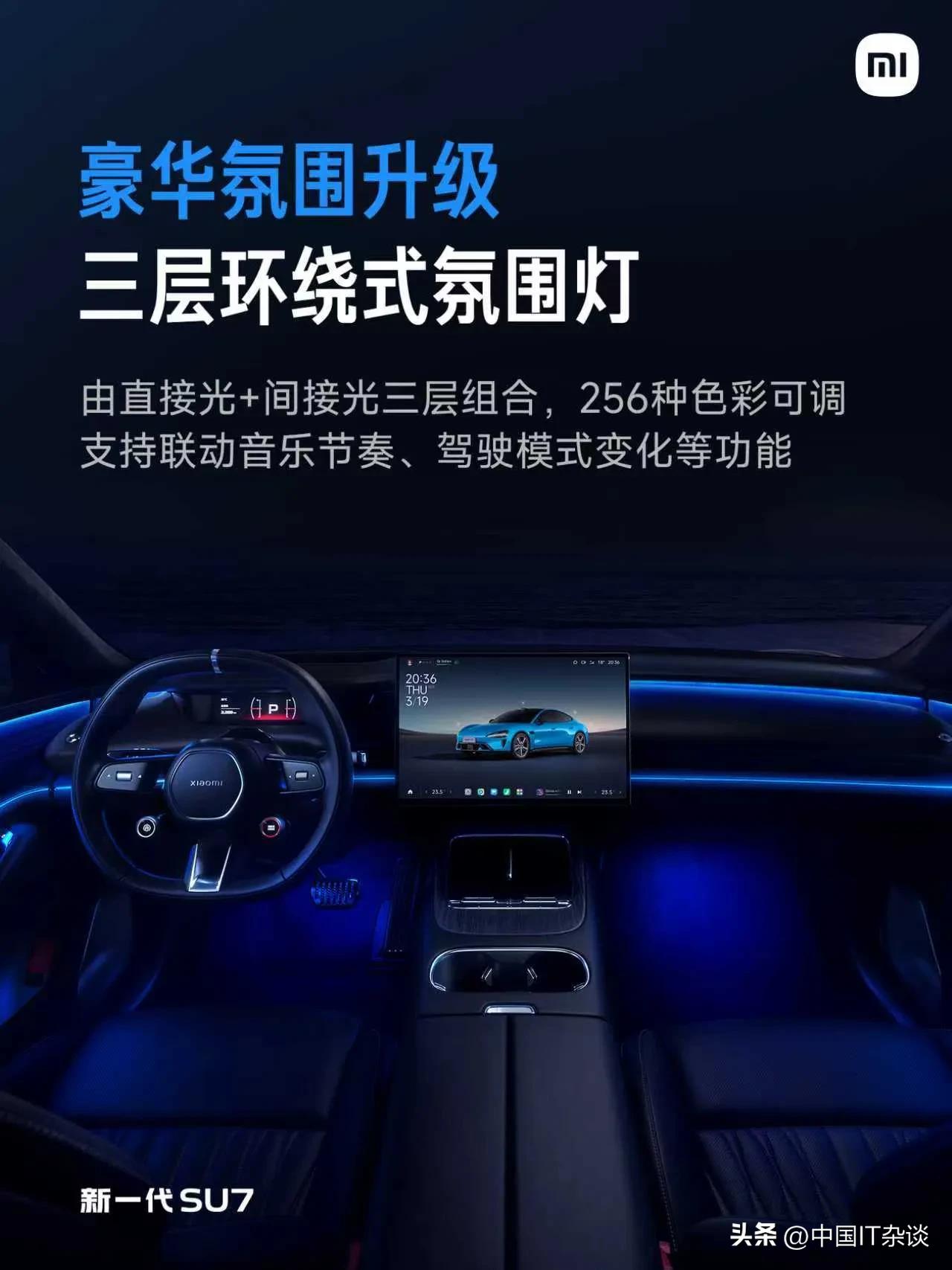 小米新SU7拥有4大色系,9款外饰颜色: 跑车色系:卡布里蓝、赤霞红、璀璨洋红 时尚色系:雅灰、流金粉、霞光紫 豪华色系:靛石绿 经典色系:珍珠白、曜石黑 感觉卡布里蓝这款新的颜色太酷了! 新一代SU7座椅大升级,兼顾运动与舒适: 主驾全系标配18向可调运动座椅,适配不同身高体型的乘客,支持座椅按摩;副驾零重力座椅,支持座椅通风、加热按摩,乘坐体验更舒适;后排躺倒角度提升至 121°,升级舒适睡眠头枕,久坐也不累。 还有三层环绕式氛围灯,豪华氛围升级;高频接触内饰面100% 软包覆,四款内饰颜色。音响系统升级,Max版标配 25扬声器豪华音响系统。