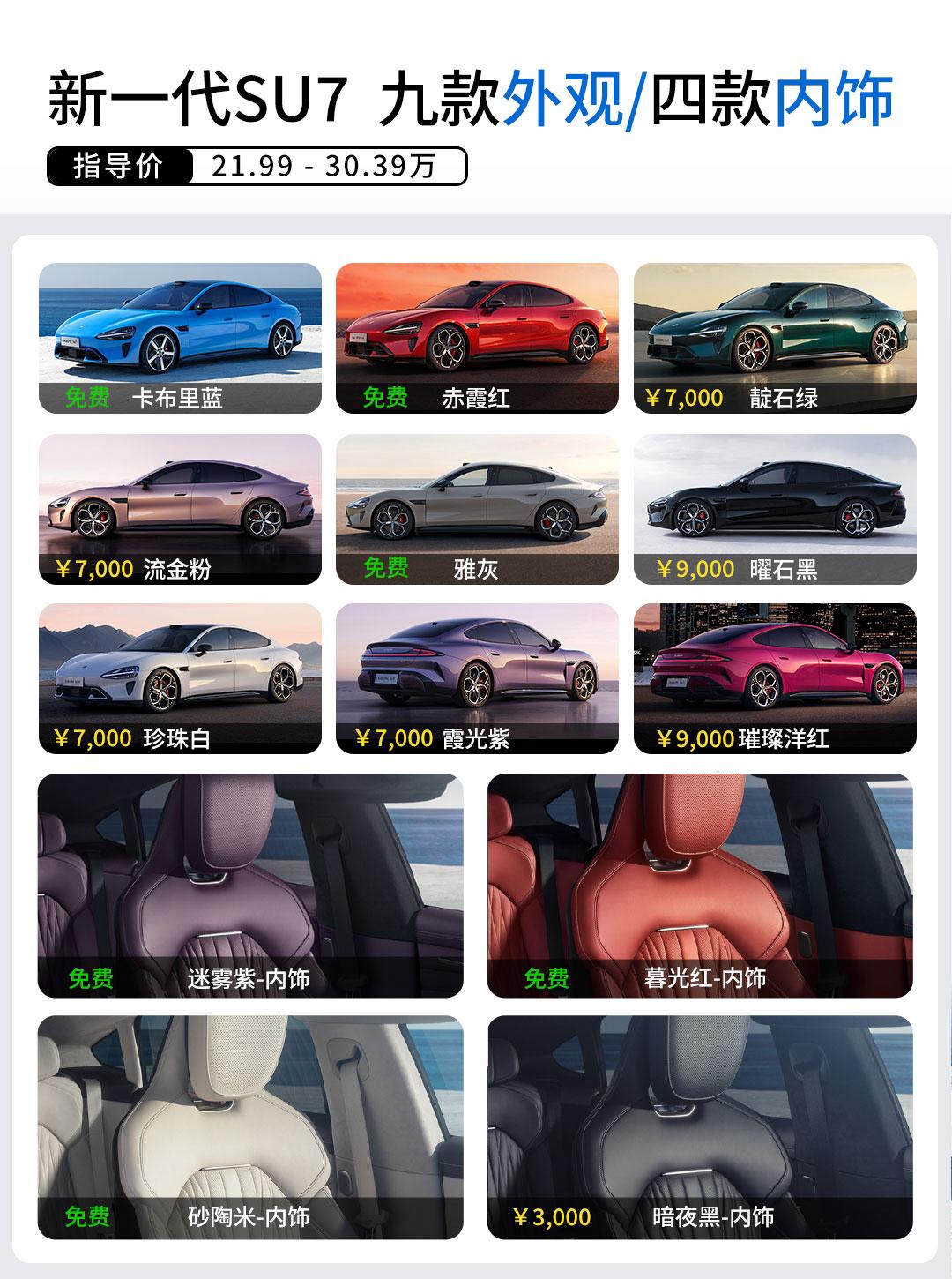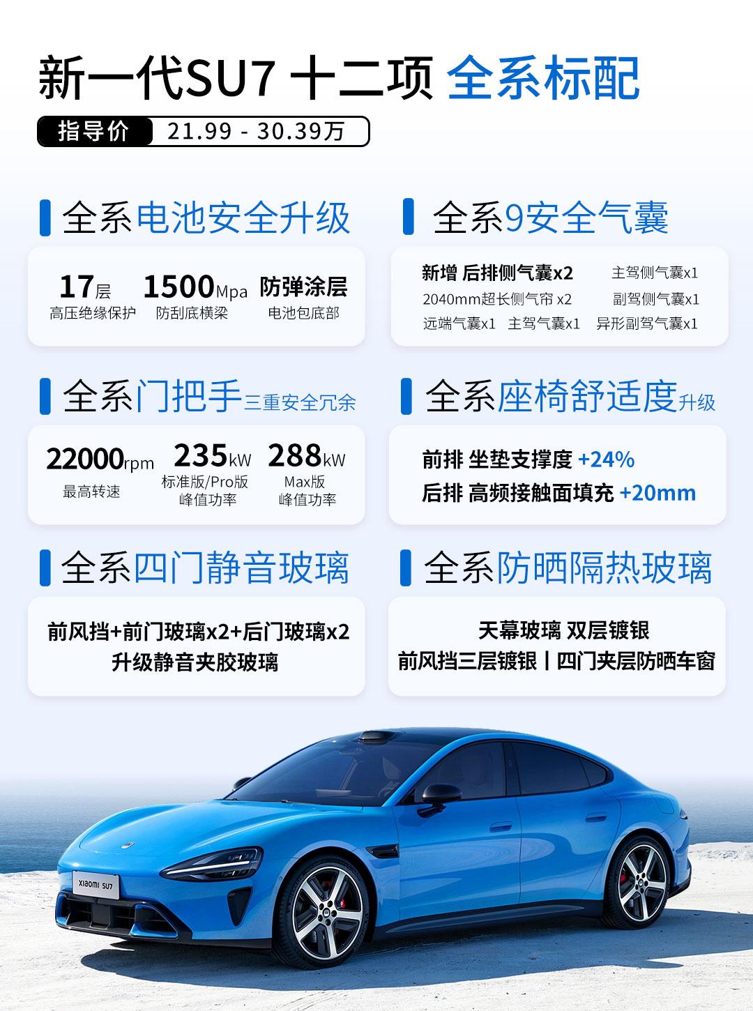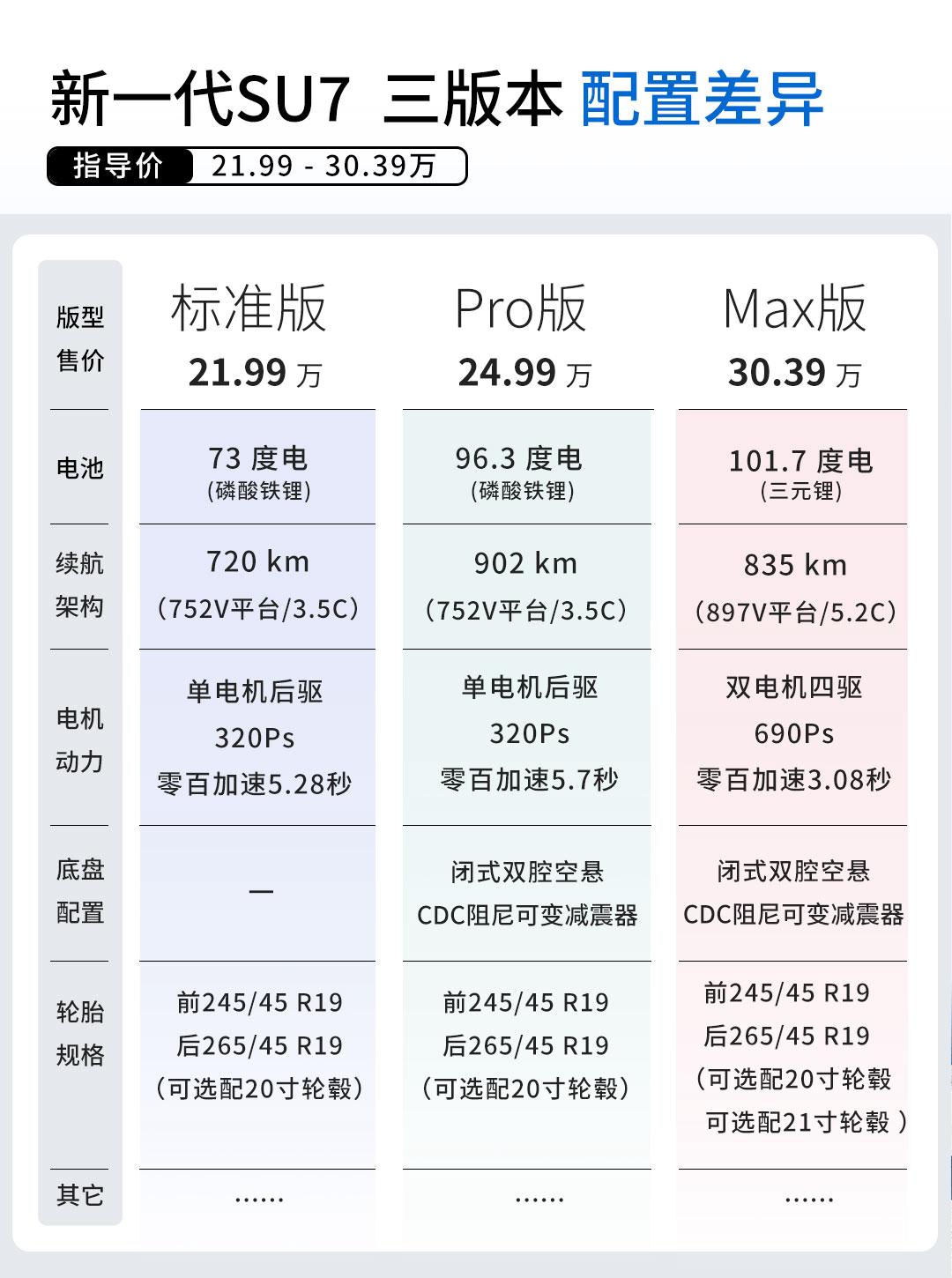 小米全新一代SU7正式上市,新车在安全、驾控、智能体验和豪华质感等方面全面升级。售价方面,新车依旧提供标准版、Pro版以及MAX版三款车型,售价分别为21.99万元、24.99万元、30.39万元。 你觉得哪个版本性价比最高呢?【来自懂车帝车友圈】