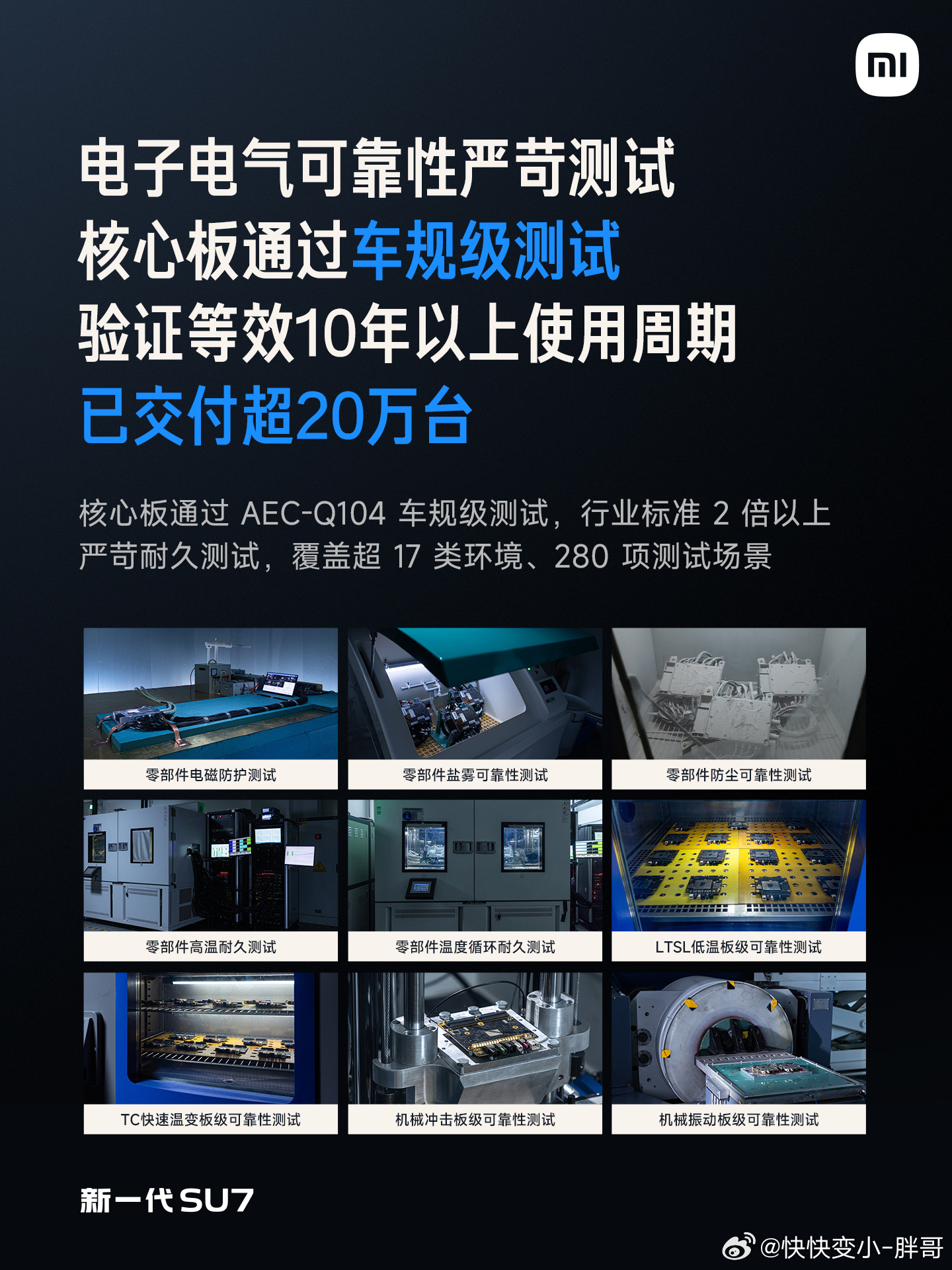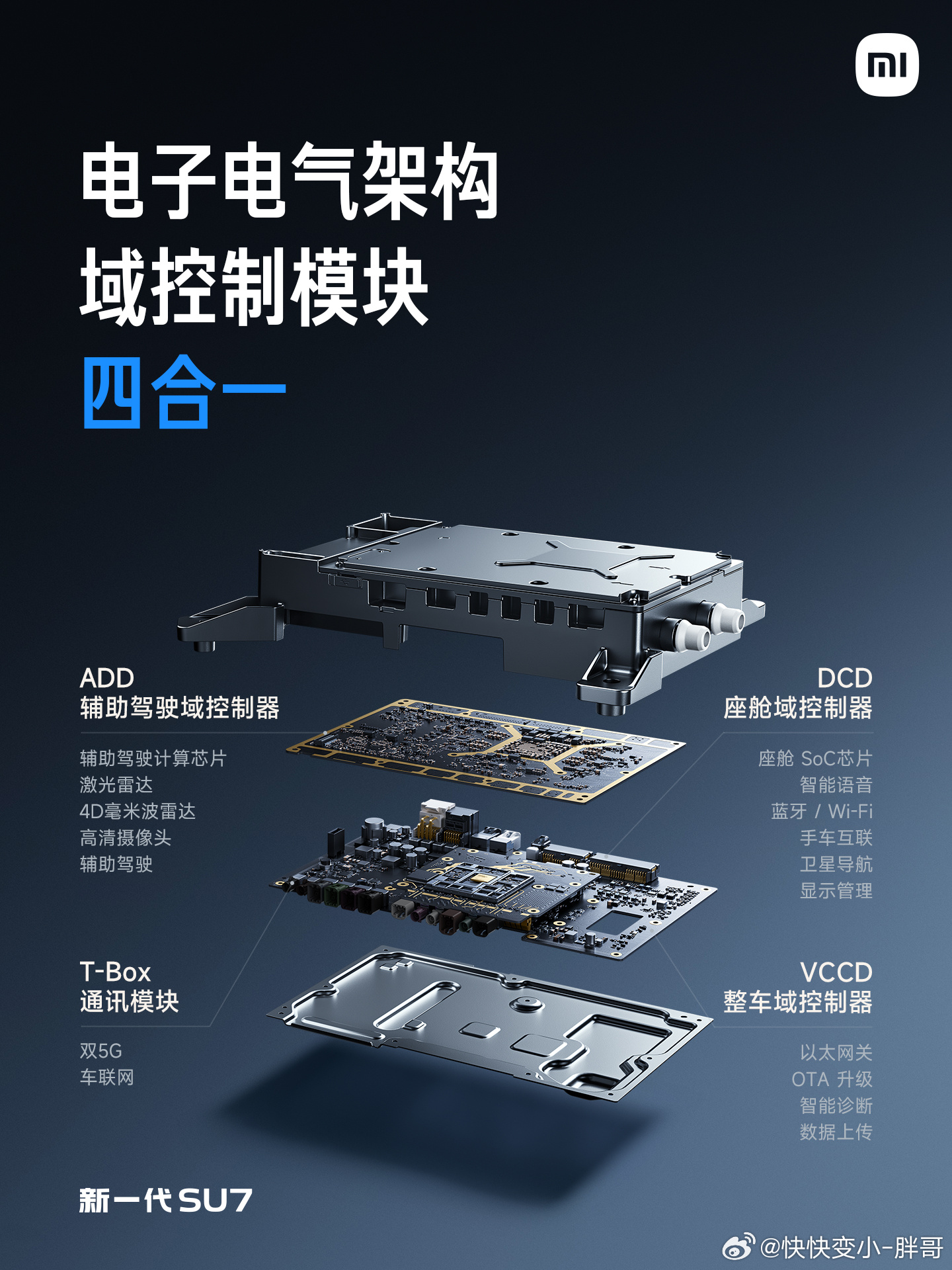 新一代SU7 电子电气架构全面升级。域控制模块四合一,面向智能时代,更高集成,更强算力。搭载旗舰级芯片,打造先进的智能座舱和辅助驾驶体验。核心板通过车规级测试,安全值得信赖;全新的电子电气架构还带来更强的体验,支持双5G 双卡双通、内置ETC免费激活等功能。哨兵模式也有升级,更省电、更智能、更安全。
