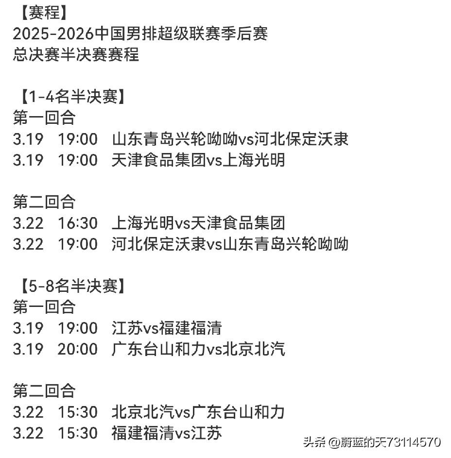 [2025~2026赛季男排A级季后赛总决赛] 一,半决赛首回合战况: 1,1-4名半决赛: ①青岛兴轮呦呦1-3保定沃隶,局分:25-19,21-25,18-25,23-25。 ②天津食品集团3-2上海光明,局分:22-25,25-22,22-25,25-23,15-9。 2,5~8名半决赛: ①江苏男排1-3负于福建福清,局分:25-27,25-19,20-25,18-25。 ②广东台山和力3-0北京北汽,局分:27-25,25-17,25-21。 二,半决赛第二回合将在22日进行,第一回合中的主客场互换,若有两队大比分战成1-1平,将进行金局决胜。
