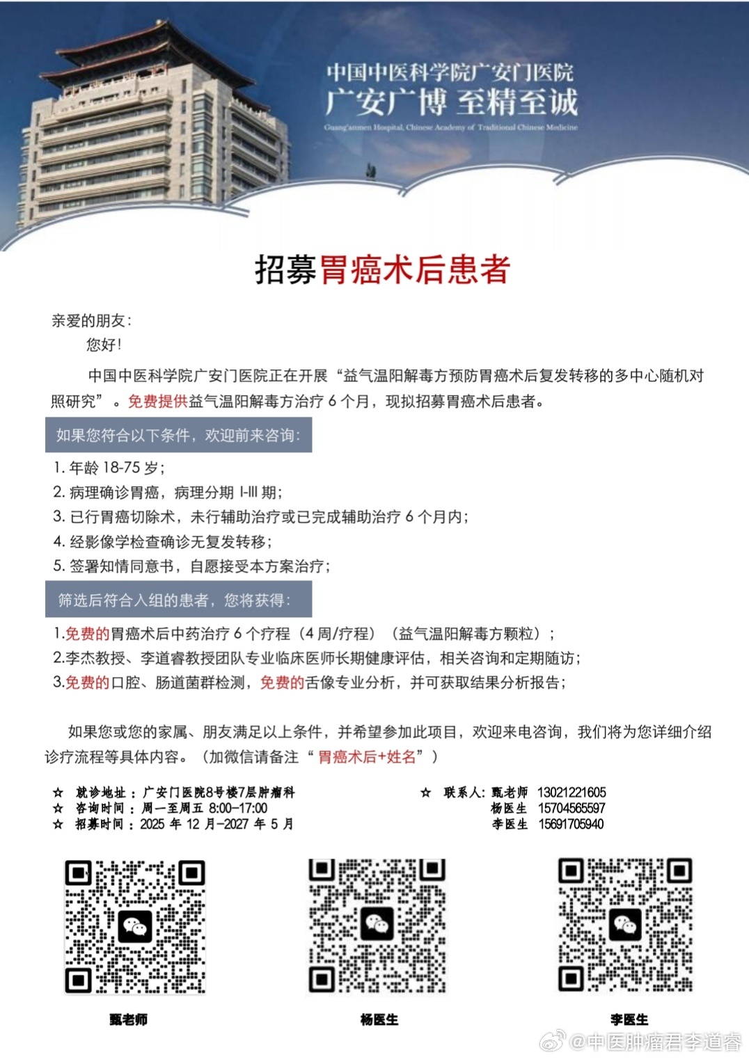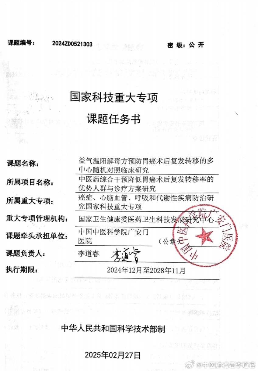国家科技部重大专项课题招募——2024年国家科技重大专项—益气温阳解毒方预防胃癌术后复发转移的多中心随机对照临床研究(2024ZD0521303)课题负责人李道睿教授招募胃癌术后患者,益气温阳解毒解毒颗粒凝聚中国中医科学院广安门医院六十余年来胃癌治疗的经验,北京市科委重大课题结果显示其可改善患者症状,减少四分之一左右的术后复发率,并获得中国医院协会科技进步一等奖的肯定。现诚挚招募胃癌术后患者,如符合入组条件,可接受广安门医院李杰院长、李道睿教授团队全程治疗康复。如有兴趣可直接咨询广安门医院5号楼7层肿瘤15病区李道睿教授课题组