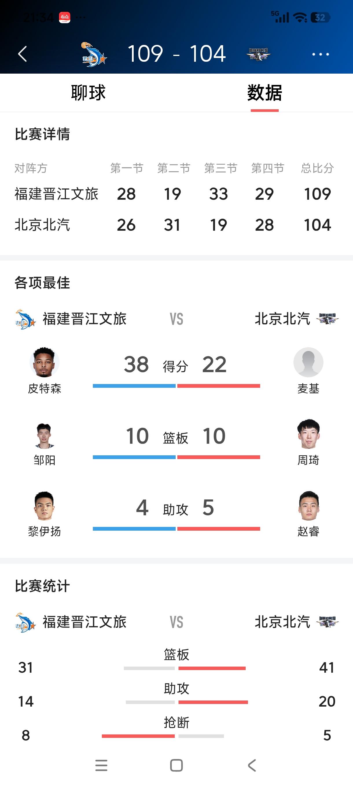 北京北汽惨遭逆转,窝囊的输掉冲进前四的关键战役!CBA常规赛第27轮今晚继续进行,拥有麦基、周琦、赵睿、陈盈骏等豪华阵容的北京北汽客场挑战排名第十八的鱼腩球队福建晋江文旅。北京北汽在领先两位数的情况下,被福建晋江文旅逆转,以104:109负于对手,无缘前四。赛前,由于排名第四山东高速负于上海久事,仅相差一分的北京北汽只要拿下福建晋江文旅,就能反超山东高速晋级四强,但遗憾的是拥有豪华内线,强力外线的北京北汽惨遭逆转,关键时刻周琦两罚不中,错失扳平良机。说实话,贵为国产第一中锋,周琦这罚球技术真该好好练练了!