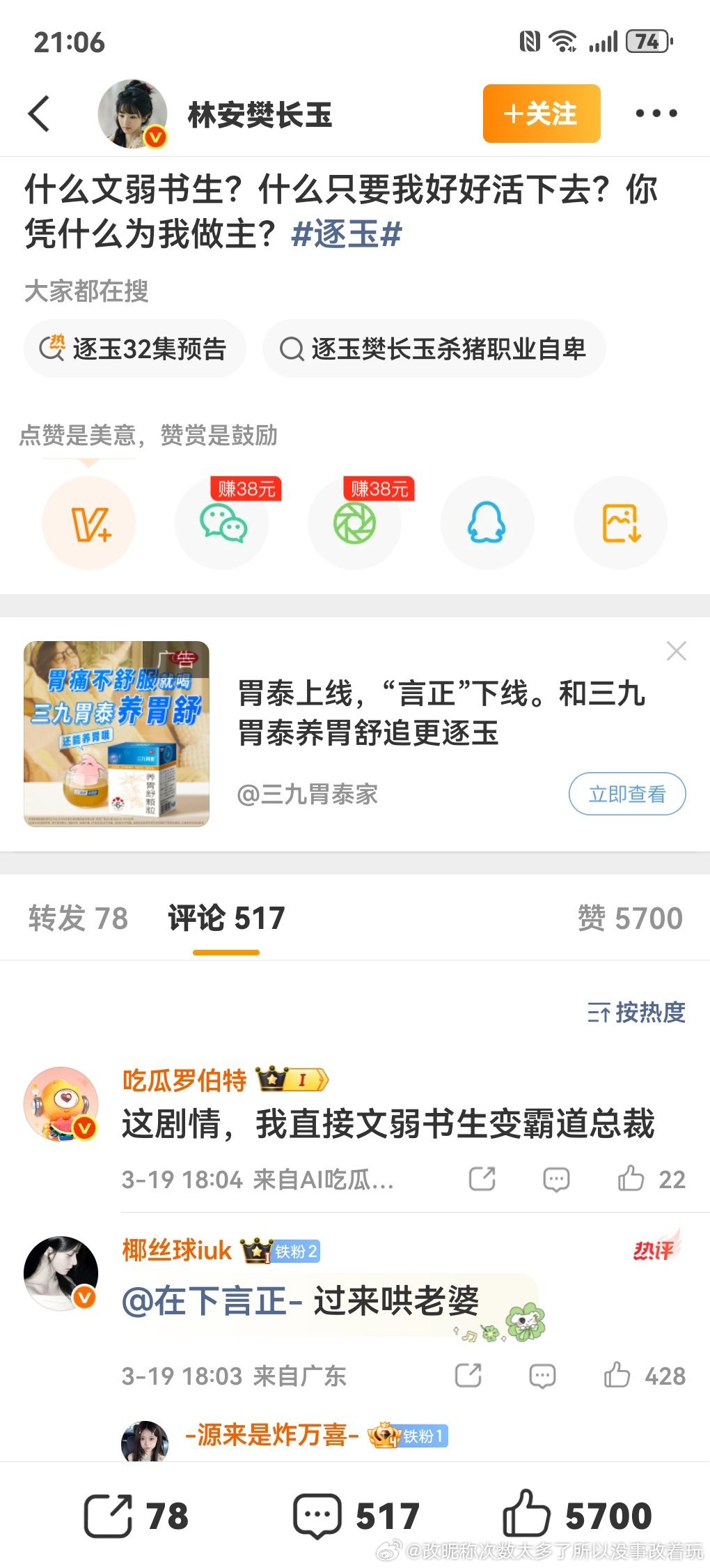 表显日播9KW的古偶女主角色号发博3h后2.0