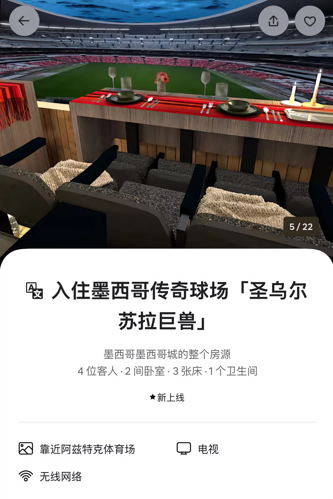 今天我还发现Airbnb竟然能住进世界杯现场「墨西哥城体育场」!墨西哥球场是这次世界杯开幕式揭幕战的场馆。在豪华包厢里以VVVVVIP视野感受世界级赛场,我只能说Airbnb还是太前卫了,球迷必冲😎