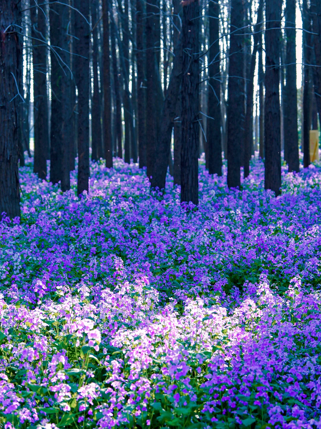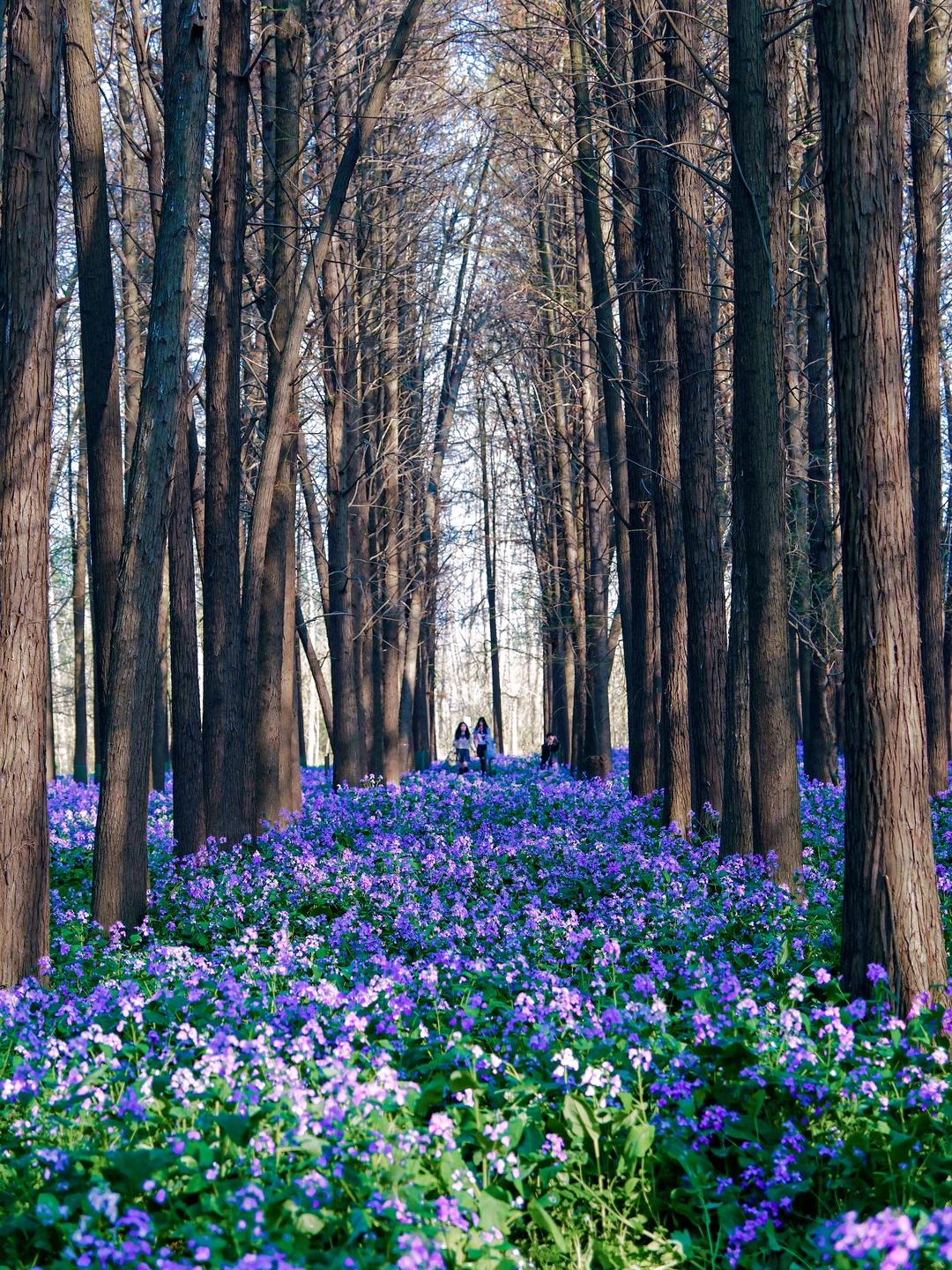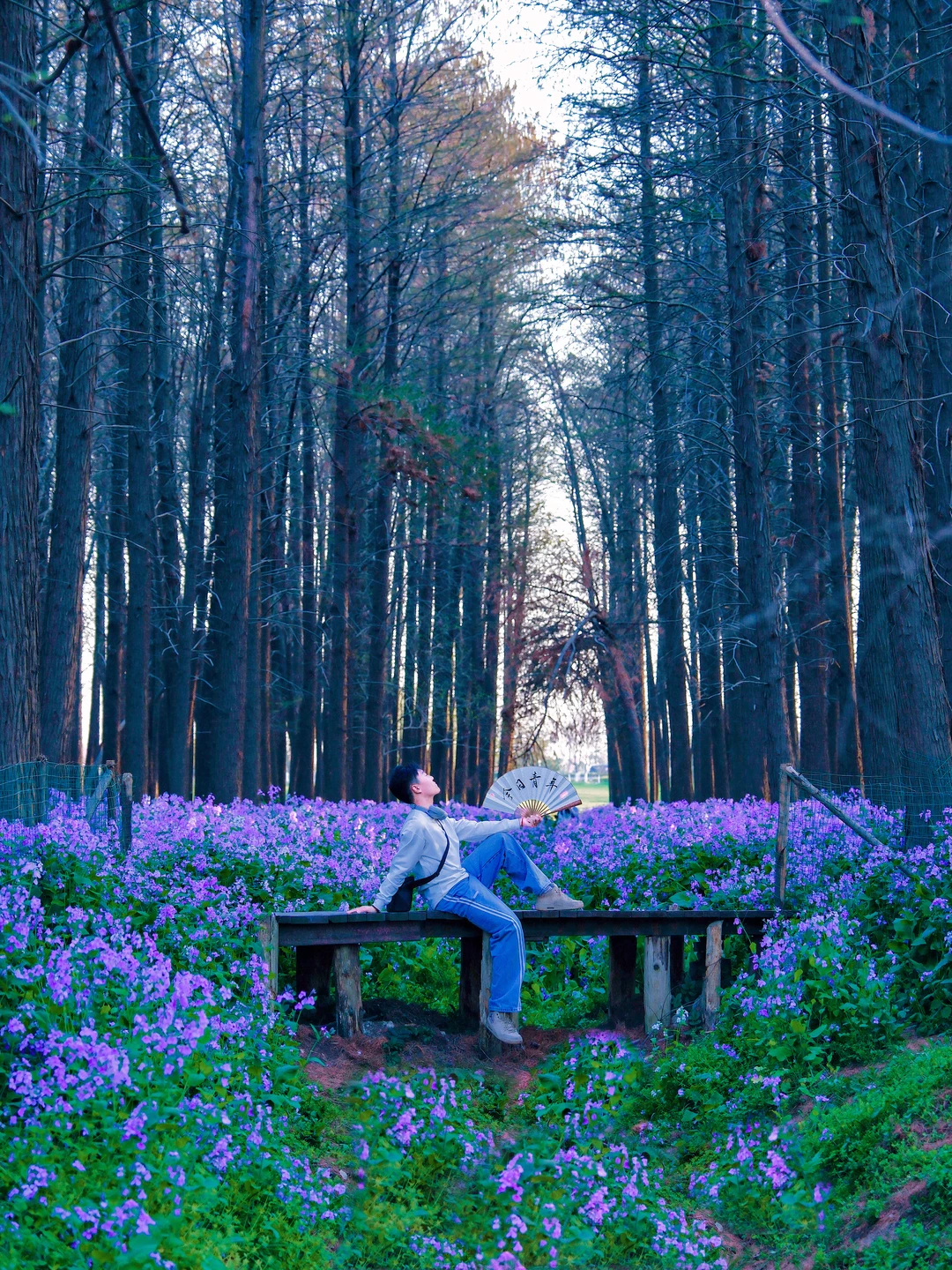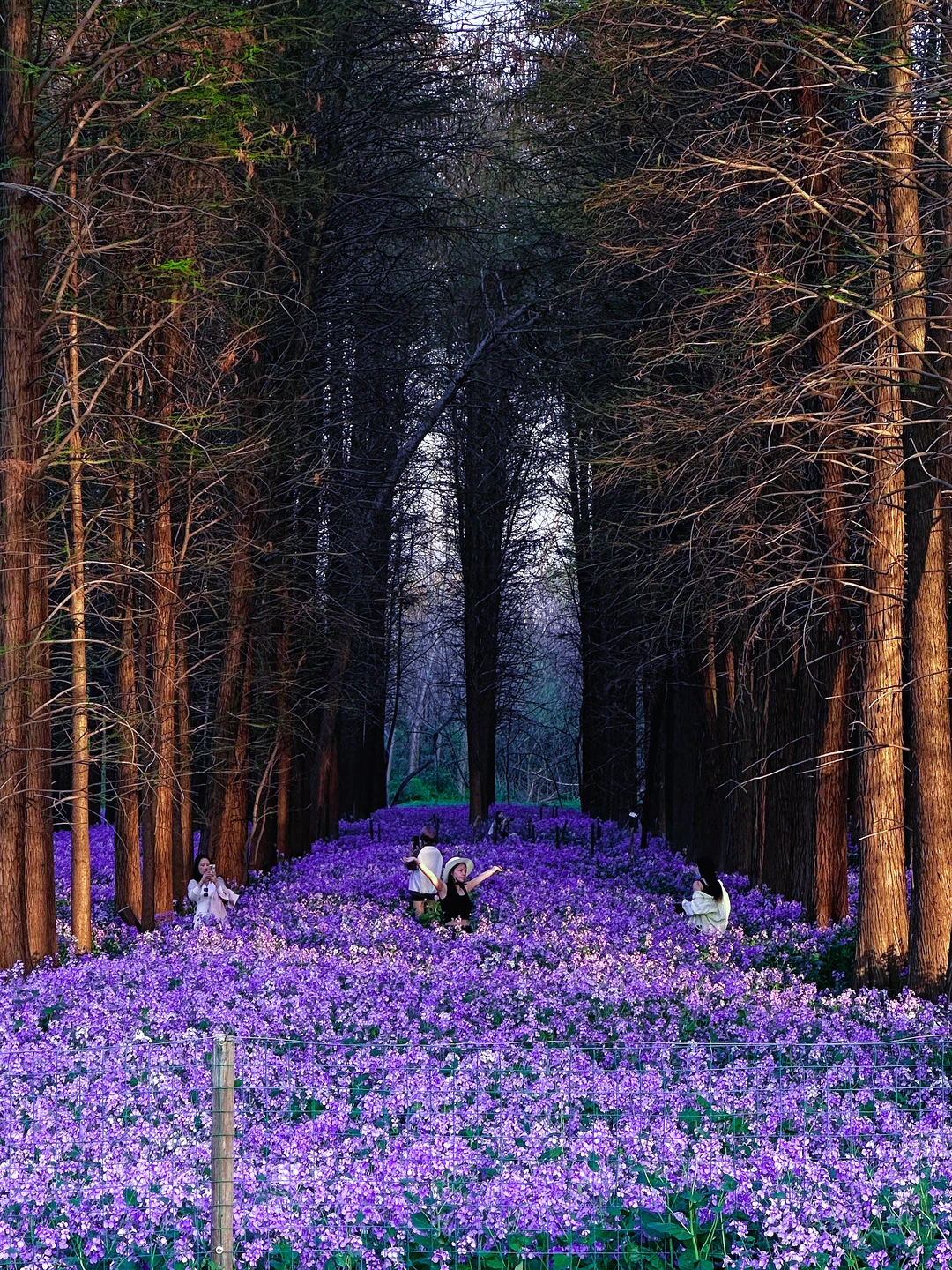 江心洲这片池杉林真的绝了! 高大笔直的杉树配上脚下一整片紫色二月兰 简直就是春日限定浪漫 📍位置:地铁10号线江心洲站2号口出,换乘486路至金陵中学站,下车就能看见对面这片秘境 📸拍照攻略: · 杉林里有木栈道,走在上面被紫色花海包围,俯拍视角绝美 · 下午三四点阳光穿过杉树,形成丁达尔光束,拍照自带滤镜 · 建议穿浅色衣服,跟紫色花海绝配! ⚠️其他小tips 周末人多,建议工作日傍晚来,还能看白鹭归巢 旁边有大草坪可以野餐 春天一定要来一次,真的会被这片紫色治愈!