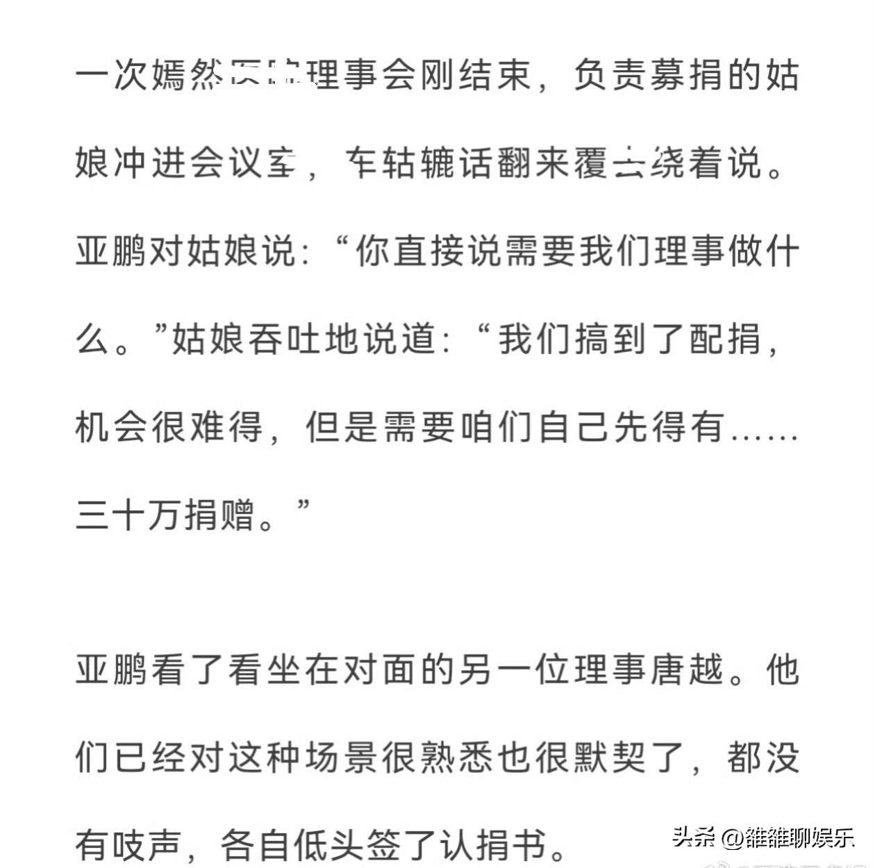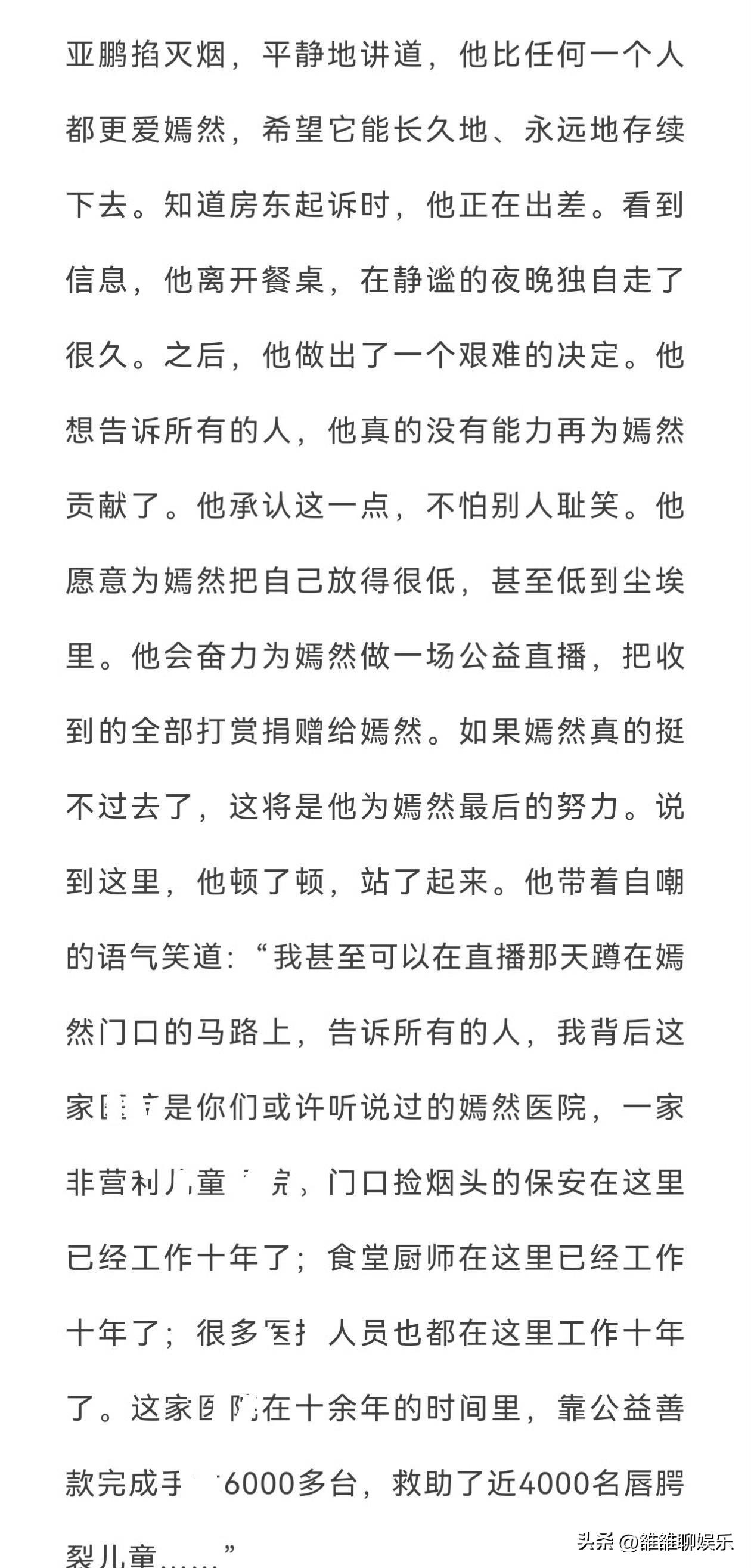 李亚鹏,冲上热搜。 近日,嫣然工作人员发了一篇千字长文,字里行间都是对李亚鹏的心疼,这到底是怎么回事呢? 嫣然天使儿童医院在成立时,李亚鹏出钱、出力,习以为常接受别人的付出,在他那里换取人情。 因为别人侵吞了嫣然基金的巨额善款,让嫣然天使基金掉入漩涡,李亚鹏的生意也受到严重影响,也因此导致李亚鹏的4000万投资案败诉,让他成为执行人上了热搜。 面对莫须有的指责,他选择了沉默,把所有的委屈全都咽到肚子里,还安慰工作人员说,这或许是一件好事,可以借之提升民众的公益认知,在被媒体攻击时,还能说出这么大义凛然的话,李亚鹏太让人心疼了。 医院资金紧张,连打印纸都要省着用,他抵押房产、变卖收藏,只为了给唇腭裂患儿做手术,为了得到配捐,在那么困难的情况下,他还是提供了三十万捐赠,疫情时医院的每一步都走的很艰难,他请自己的友人帮忙,借了1500万,可还是举步维艰。 本就很难了,结果因为拖欠房租1000万,嫣然医院又被房东告到法院,李亚鹏曾用个人信用为嫣然房租承担连带付款的责任,当工作人员看到这个保证书时,内心特别心疼李亚鹏,因为天底下没有傻子会这么做。 为了让医院能撑下去,他做了一个大胆的决定,他准备告诉所有人,他没有能力再为嫣然医院做贡献了,他不怕别人耻笑,他想最后为嫣然做一次努力,于是他开了一场直播,也就是这场直播,让他救了嫣然,也让很多人知道,这么多年,大家都误会他了。 如果没有嫣然工作人员的描述,或许我们会一直误解李亚鹏,这位把情怀刻进骨子里的男人,救助了上万名唇腭裂孩子,为了让更多的孩子得到救助。他不怕贴上“失败者”的标签。 李亚鹏,一个有大爱有担当的男人,我们都应该为他竖起大拇指。 李亚鹏捐款