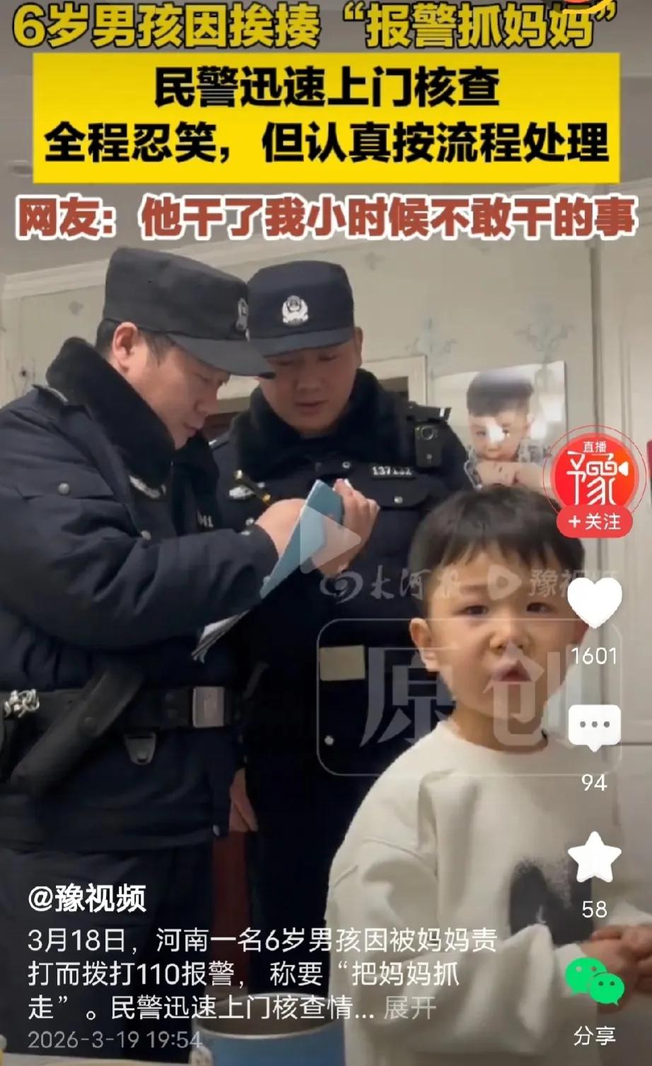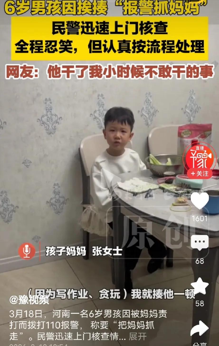 河南焦作,女子教儿子写作业,他边写边玩,女子一气之下揍了他一顿,孩子吓得哇哇大哭,边哭边喊:“妈妈你打我,我要报警抓你”。女子以为儿子只是随口一说,没想到,几分钟后几个民警齐刷刷来到家里,女子哭笑不得,民警的表情亮了。 张女士的儿子是2019年7月份出生的,今年7岁,读小学一年级。 3月18号晚上,老师布置作业回家写,本来很简单的几道题,如果认真写,很快就能完成了,以张女士儿子那智商更是不在话下。 可偏偏他却很贪玩,写一下玩一下,拖拖拉拉,磨磨蹭蹭,半天过去了没写得几个字。 张女士经常教育儿子,不管做任何事,都要有始有终,坚持把一件事做完了再做下一件事,想玩也可以,但得先把作业完成了。 每次,儿子都答应得好好的,张女士坐旁边的时候还好,张女士一离开儿子立马又开小差了。 那天晚上,张女士一开始是坐儿子边上看着他写的,谁料她起身忙点事,忙完回来,发现儿子不仅一个字没动,人家玩得正尽兴呢。 张女士一看,瞬间火冒三丈,吼了他,不料儿子非但不知错,还找理由辩解,说他只是碰一下玩具。 不知错还嘴硬,这让张女士更生气,她站起身把儿子拉起来,“啪、啪”直接在他屁股上抽了两下。 平时道理讲多了没用,实在是忍无可忍,收拾了他,看他长不长记性。 本以为儿子被打了会害怕,会收敛,然后马上乖乖写作业,没想到儿子非但不安静,还嚷嚷着说要报警,他说妈妈打人,妈妈最坏了,要报警抓走妈妈。 张女士听了又气又好笑,调侃说,那你报啊,你倒是报啊,看看民警叔叔来了,是抓你还是抓我啊。 张女士家里本来就有一部旧手机,是放在家里平时给孩子玩玩或者看动画片。 儿子可能真气上头了,张女士说完,他直接拿起旧手机摁下110报警电话。 男孩哭着对电话里的接线员说,你们快来救我,妈妈打我。 张女士没来得及阻止,儿子已经打电话并跟对方说清楚了。 张女士还是以为,儿子只是一个孩子,民警应该不会听孩子的话。 万万没想到,几分钟后,有人敲门,张女士一看,瞬间傻眼了,4个穿着制服的民警齐刷刷站在她门口。 接着民警问,刚刚是谁报的警?儿子一听,直接跑出家门口迎接。 小男孩一看到民警委屈得泪水直流,他开口第一句话就是**叔叔,我妈妈打我。 民警在了解事情真相后,就开始按流程给男孩做笔录。 他们问孩子,叫什么名字,男孩说,他叫宫子俊,是2019年7月4号出生的。 民警又问孩子身份证,他忘记了号码,想让妈妈去拿户口本,妈妈假装生气说,不帮忙。儿子一看又委屈地哭鼻子了。 最后,民警让他签字,男孩很认真地写下自己的名字。民警看着男孩一副半小大人的样子,好气又好笑。 后来,张女士把孩子支开后,跟民警解释了事情的来龙去脉。 民警教育并,开导了张女士。张女士说一开始她以为儿子只是说说罢了,没想到他来真的。 儿子报警后,她也没想到,民警真的当真,上门了,一来还来了4个,她觉得有些不好意思,这是浪费了警力。 民警解释说,哪怕是孩子,他们也得上门问清楚才放心。 对此,网友纷纷表示说,给民警点赞,为了孩子出警还认真的记录,没有因为是妈妈打孩子就糊弄,给了孩子足够的尊重! 有网友分享他的经历:感觉现在的帽子叔叔还真挺不错的,我儿子10左右的时候,我发现他偷拿我的10块钱,我问他他开始还不承认,我把他打一顿还不解气,直接把他带到派出所去了,结果帽子叔叔非常好,很认真的给他讲道理,讲厉害关系,后来我儿子就再也没有出现过这种情况了。 《治安管理处罚法》第43条规定:殴打他人的,或者故意伤害他人身体的,处五日以上十日以下拘留,并处二百元以上五百元以下罚款;情节较轻的,处五日以下拘留或者五百元以下罚款。 张女士因孩子写作业拖拉打了孩子屁股,虽属于教育惩戒范畴,但已构成殴打他人的行为。 不过因情节轻微且是亲子间教育纠纷,未造成实际伤害,民警主要以教育开导为主,未作出处罚。 同时也体现了对未成年人权益的重视,即便报警人是儿童,警方也会依规出警核查,保障未成年人安全。