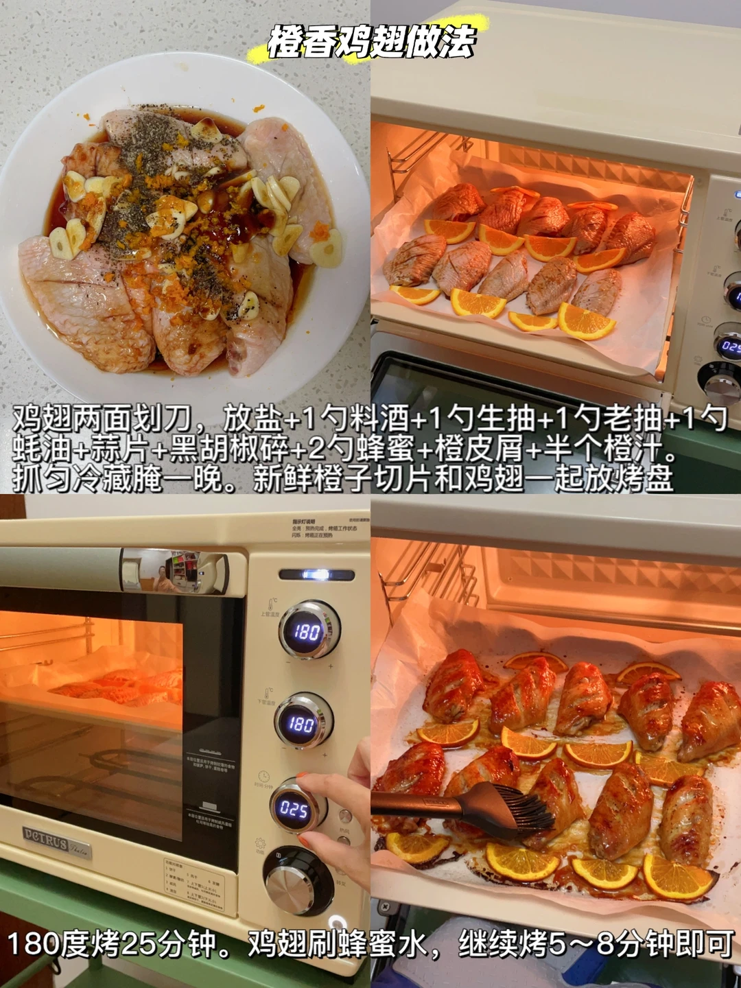 加了鲜橙汁和橙皮屑的鸡翅多了一份清香,有条件提前一晚腌制、连骨头都入味。烤箱烤时候注意观察上色、适当增减时间