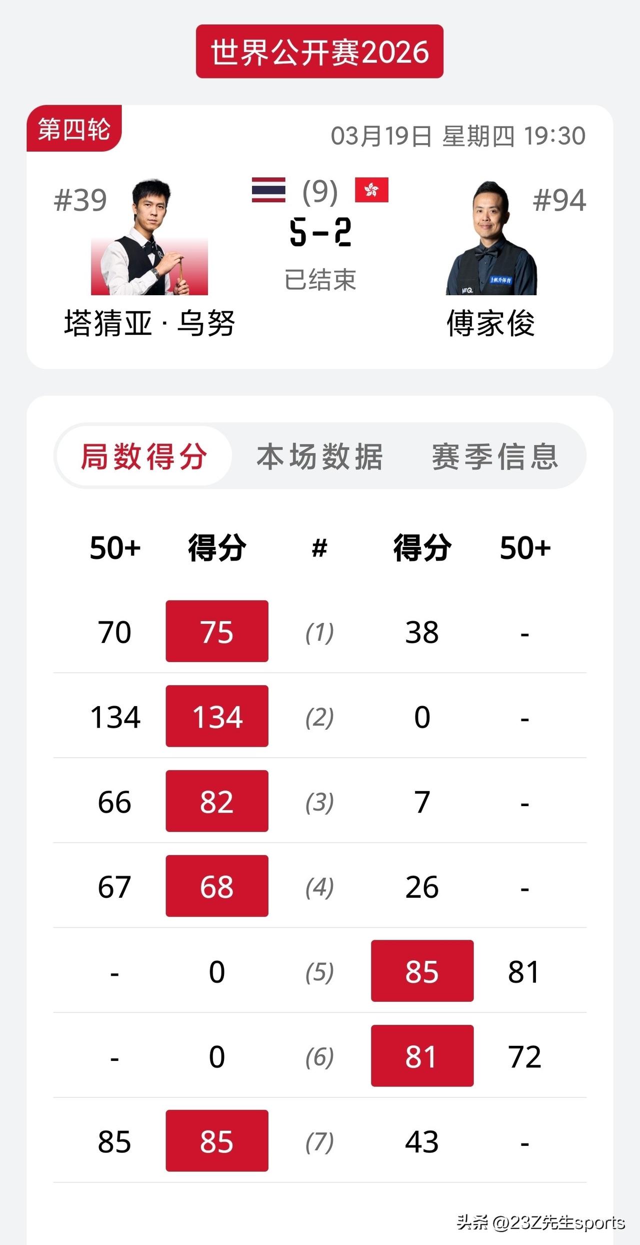 今晚的另一场比赛,塔猜亚连续高分破百,4-0领先。傅家俊单杆81、72分挽救两个赛点,最终同样以2-5告负,无缘8强。傅家俊和赵心童今晚双双出局,无缘在1/4决赛带来中国德比!(本来还想说几乎锁定一个四强席位……)[发怒][泪奔]
