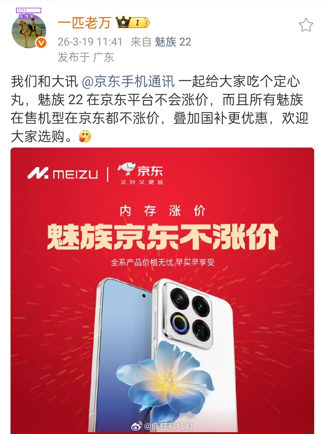 魅族22不会上调售价 最近手机涨价的消息刷到没?好多机型都涨了几百块。刚看到魅族的回应:魅族22在官方主要平台不涨价,京东那边连在售的所有机型都保价,还能叠国补,性价比直接拉满。虽然部分渠道店可能会跟着行情调价,但售后是统一的,想换手机的可以蹲一波官方渠道!魅族22将保持不涨价