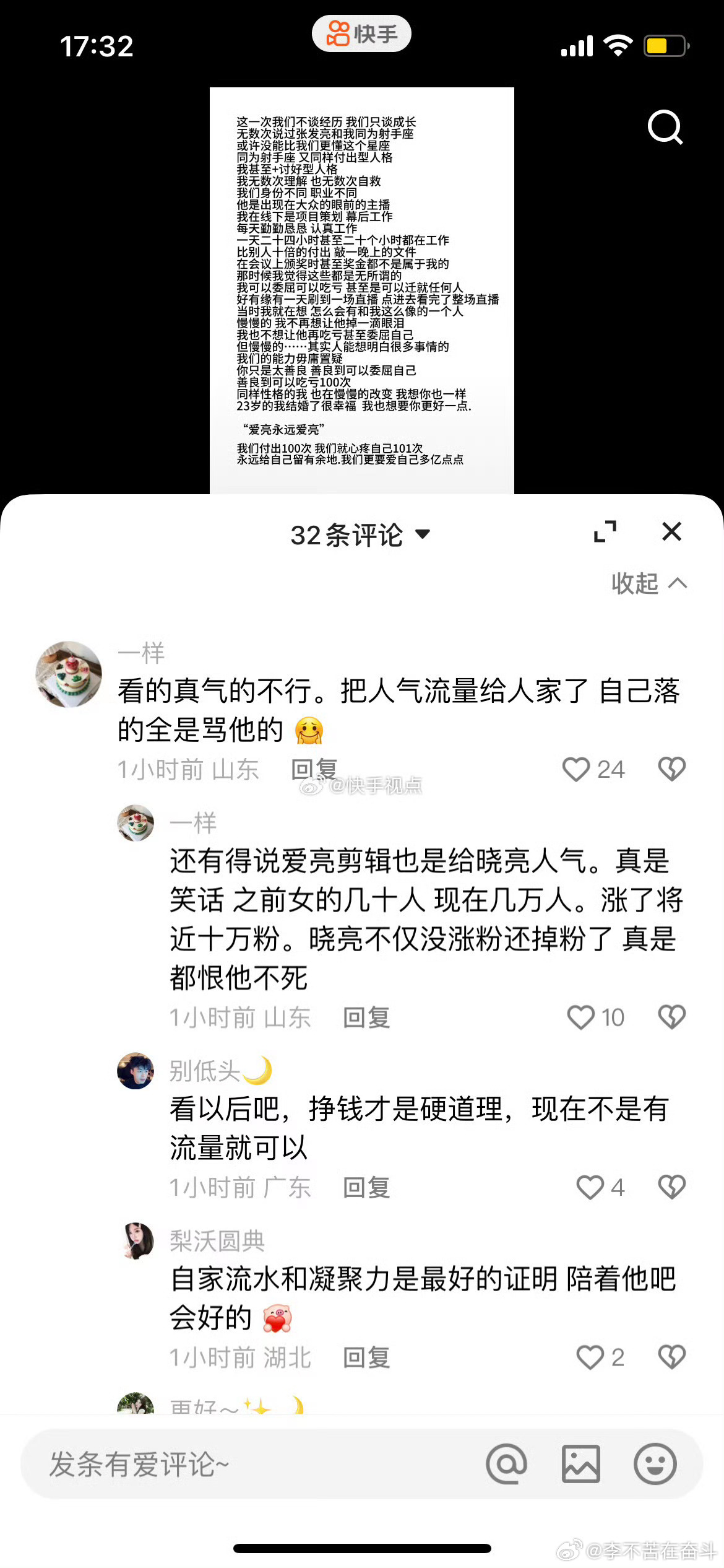 真是让人太开心了 ,爱亮把流量全部送给琪琪了,人家直播间都有4到5万人,点心都有150万,结果带给自家哥哥全是恶评,全平台恶骂,听说琪琪今晚进晚上9点档,到时候女方人气比男方高,爱亮可要全体破防该不会晓亮洗完爱亮的脑刷完礼物后又变一个嘴脸转身又连麦琪琪继续宝贝宝贝叫吧,你们爱亮要怪就怪这这个大妈吧,是她们给你们洗脑假扮cp粉,叫你们唯粉剪辑cp视频,现在知道后悔啦,已经来不及喽,女方唯粉都开始骂你们了,还有晓亮,再不把大姐维护好,可要彻底拉了,人家大姐刷的是钱,只喜欢个人,你到好,还让唯粉维护她,在直播间和琪琪搞暧昧,封面还是暧昧图,不要靠你那不值钱的眼泪还换取大姐的同情 ,给你刷,你当大姐傻呀今晚就看你咋发挥