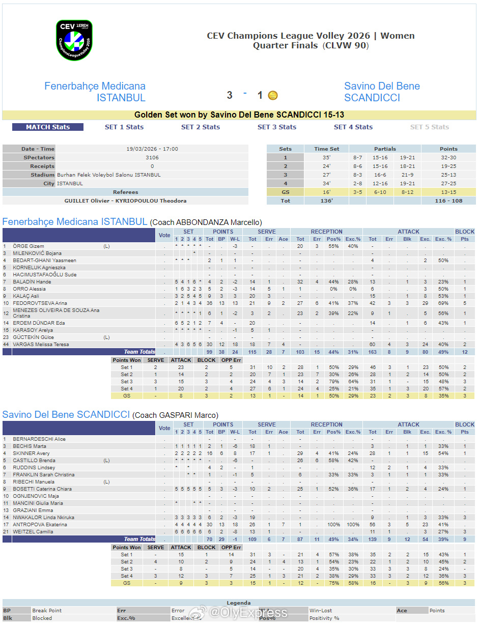 【欧冠女排斯坎迪奇金局绝杀费内进四强 安娃巴尔加斯30分彩娃36分】国际排坛战报