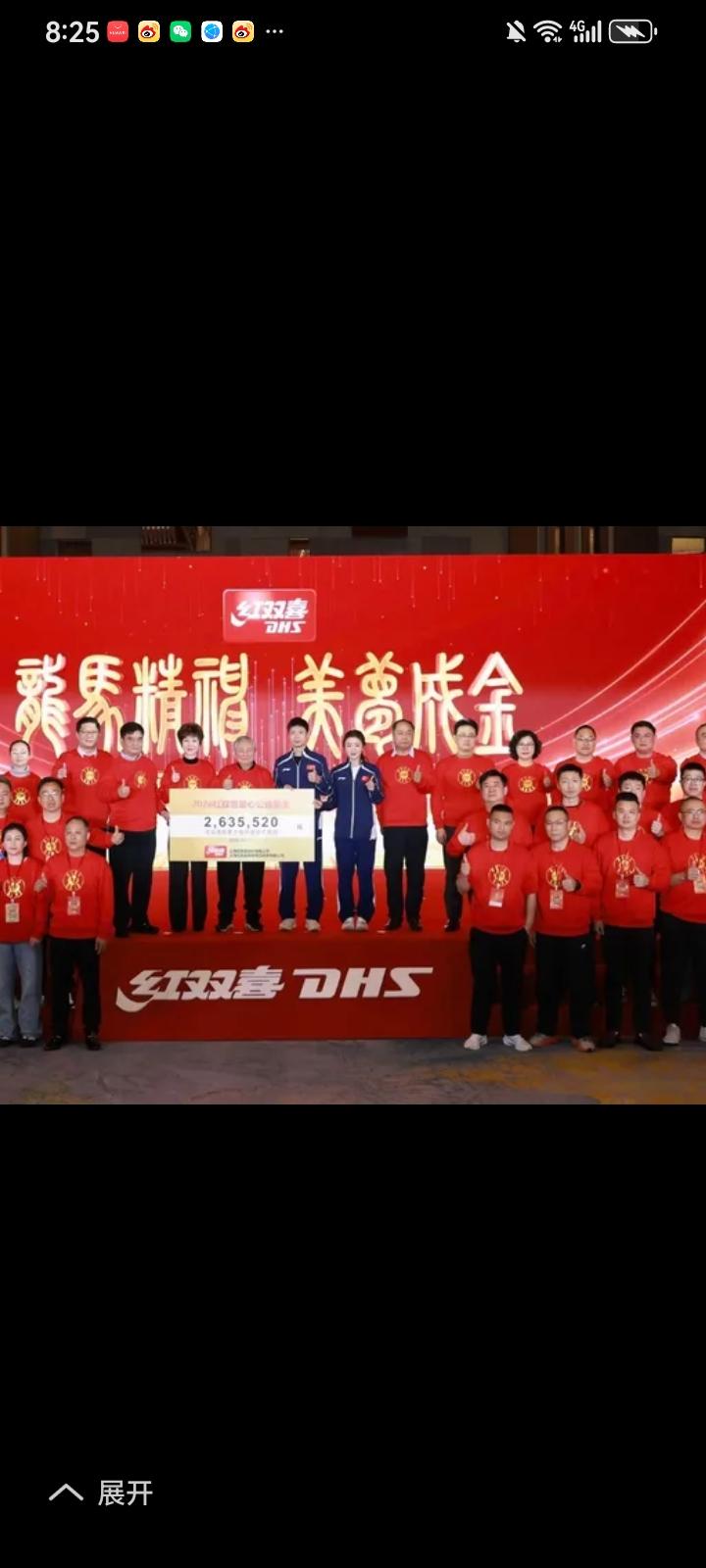 3月17日红双喜上海举办爱心公益晚会,国乒前辈徐演生,曹燕华,奥运会冠军马龙,陈梦,参加这场龙马精神,美梦成金的主题公益晚会。 马龙,陈梦,王楚钦,孙颖莎,王艺迪,陈幸同,蒯曼,陈熠,向鹏,薛飞,黄友政 签名的球拍,球套装,义卖。 募集到635520元,红双喜捐赠200万。共263多公益基金。用于偏爱地区学校体育用品,国乒传递正能量,队员们为国争光,为国家做贡献。都是最棒的[赞][赞]
