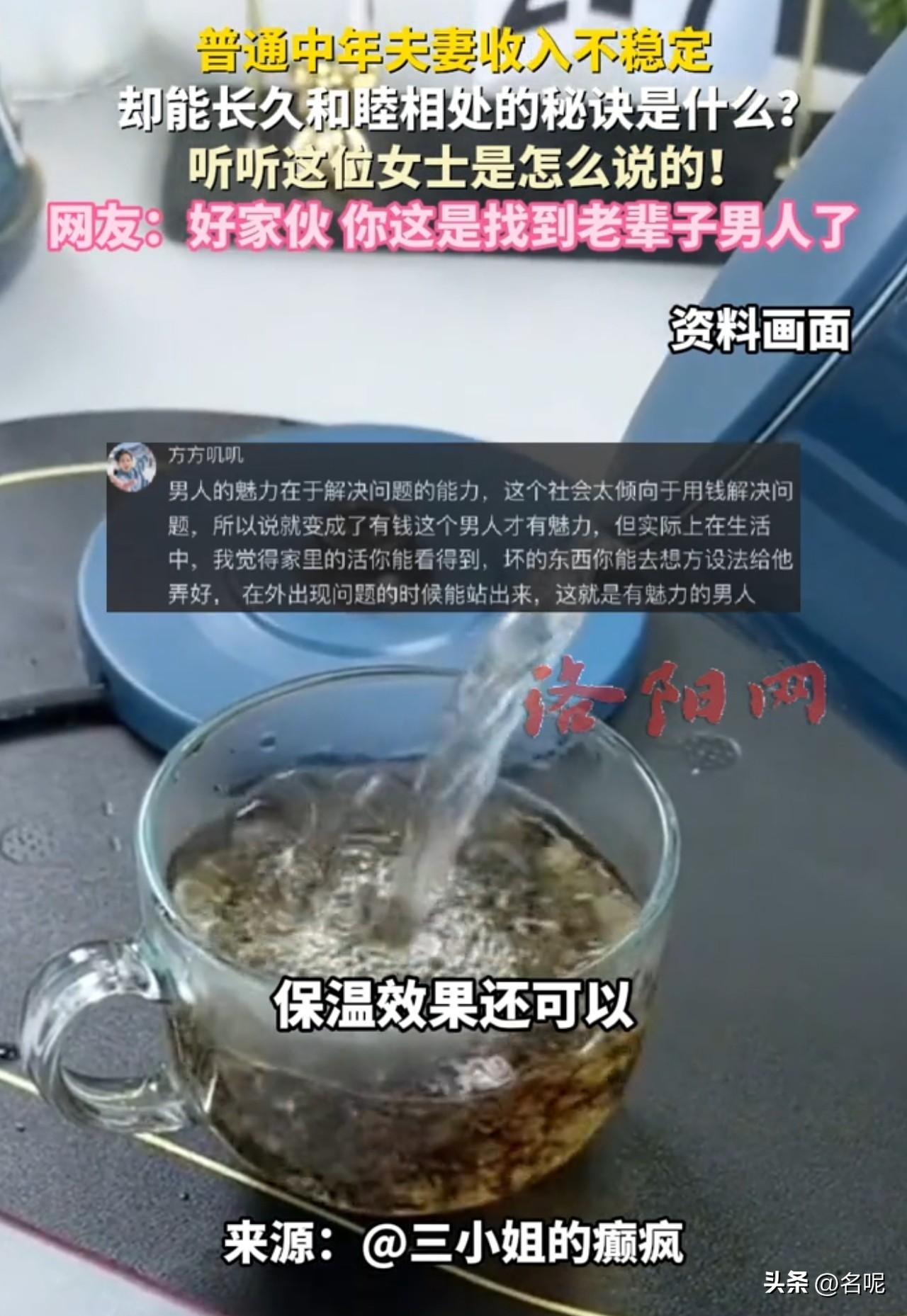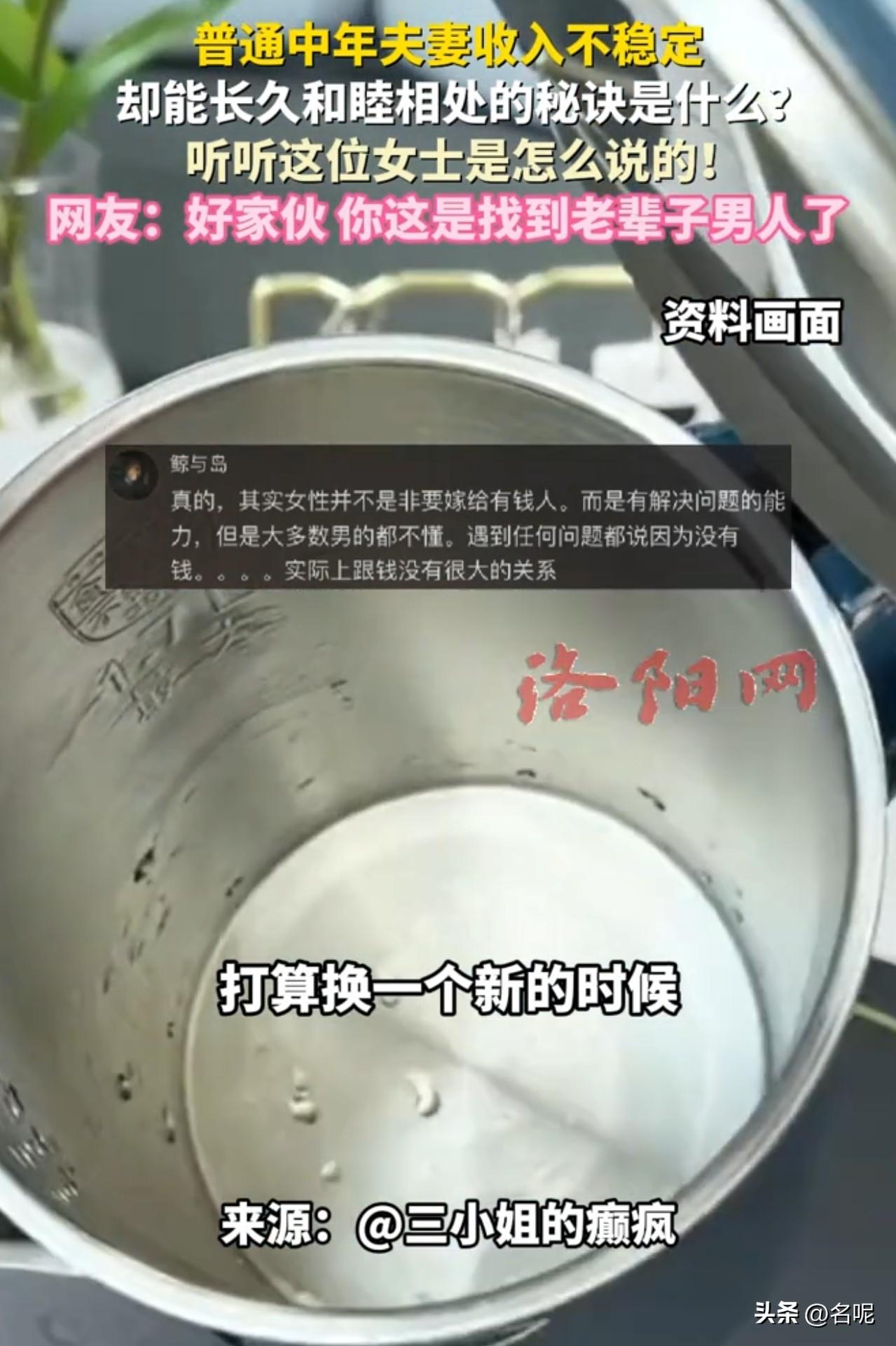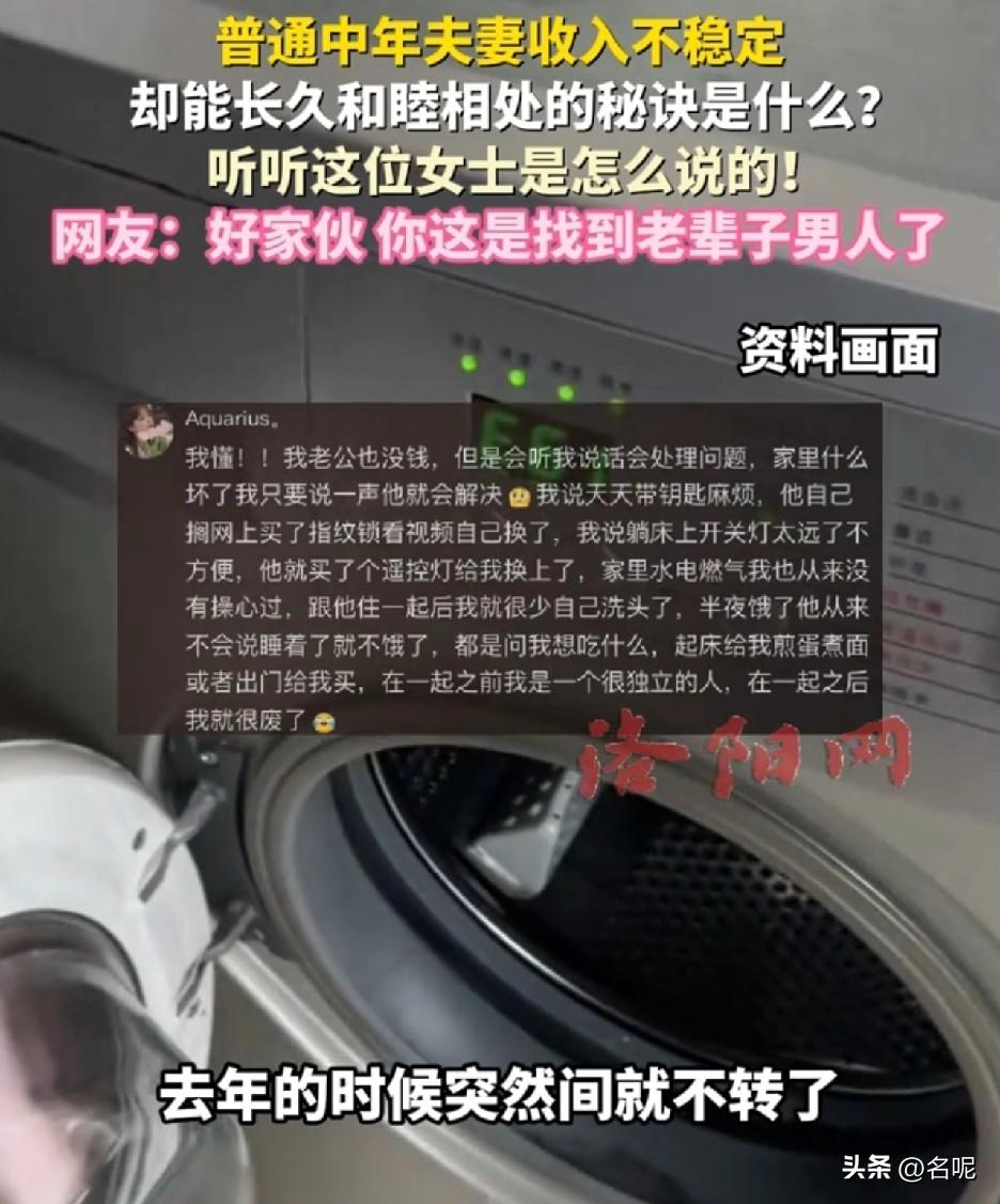 湖北,一女子分享夫妻收入不稳定,却能长久和睦相处的秘诀。 “这个水壶已经用了好几年,保温效果还可以。它是按这里之后才出水,然后不小心把它按破了。打算换一个新的时候,他就买回来个这个,装上去之后,又已经用了一年了。 水龙头生锈了,没几天就换了这个,他说这样洗头方便。这个洗衣机已经用了7年了,去年的时候突然间就不转了,找了师傅来修,说要500多块。过了没两天收到一个零件,他回来之后,按照客服的视频,捣鼓了一个小时,这又用了一年多了。 有时候我还没注意到这些细节,但是过几天发现这些东西变好用了。说实话,在那一刻,我真的会在心里觉得自己特别幸运。”这就是幸福的样子,女子在介绍她丈夫的时候,那种洋溢的表达从言语间都能看得出来,她很幸福。 女人需要的从来不是大富大贵,而是需要男人眼里有事、心里有你、遇事能扛。 收入不多,很穷,但丈夫用行动诠释了责任与担当。他不会因为物品坏了就去责怪女子,发脾气,而是主动想着怎么去解决问题。甚至,有时候不需要女子去提醒,问题就解决了。 一个男人最顶级的温柔,就是不抱怨、不指责,默默把问题解决掉。这样的“托底”生活,才是女人想要的。 好的婚姻,从来都是双向奔赴,丈夫很好,这离不开女子的功劳。女子懂得知足,不贪心不攀比,更重要的是给予积极的情绪价值。 这种小事有回应、大事有担当、情绪有包容的日子,就是很多人穷尽一生想要的幸福。