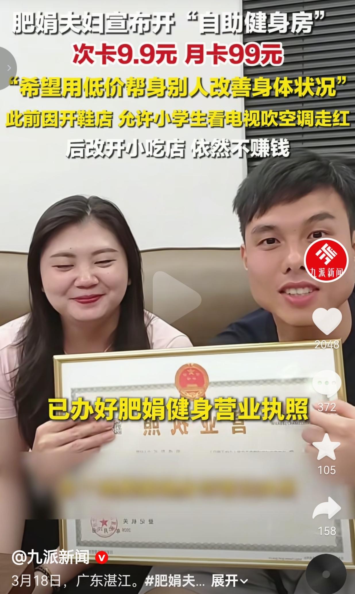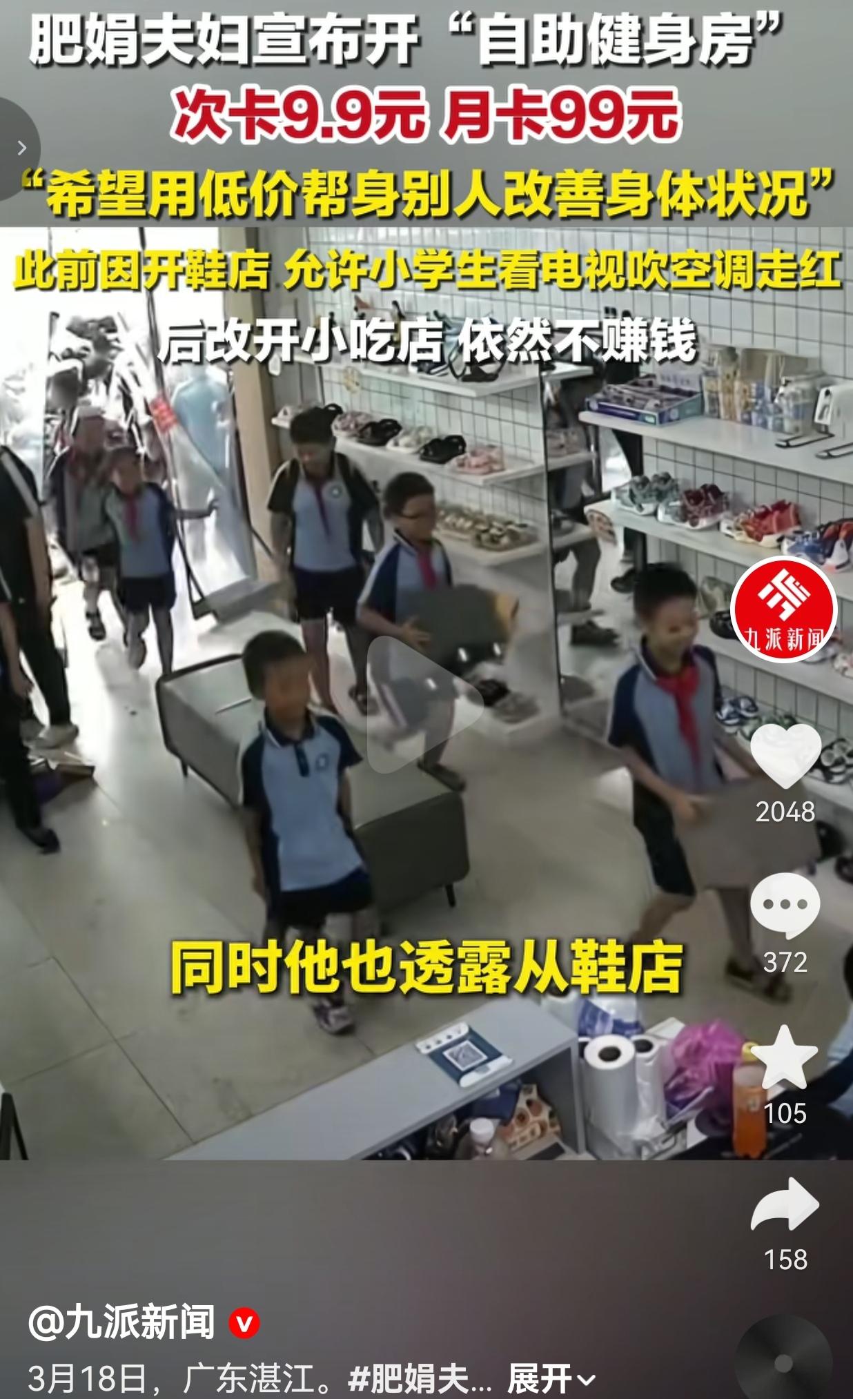 真的破防了!广东湛江那对靠“暖心鞋店”火遍全网的肥娟夫妇,又折腾出新花样了——这次直接跨界开自助健身房,次卡9块9,月卡才99块! 可谁能想到,他俩从鞋店到小吃店,一路亏到现在,再赔下去今年就得关门上班去了! 还记得当初他俩的鞋店吗?一群小学生放学挤在店里,吹空调、看电视,哪怕不买鞋,夫妻俩也笑脸相迎,就凭这股子实在劲儿圈粉无数。 后来想着多赚点钱改开小吃店,结果还是不赚钱,连房租都快扛不住了,肥公说“再亏损今年就散伙上班”,听着都让人心酸。 可就算日子过得紧巴巴,他俩还是没忘了初心。3月18号直接晒出营业执照,官宣4月开自助健身房,定价低到离谱:次卡9.9元,月卡99元,就想让普通人花点小钱就能锻炼,帮身边人改善身体状况。 网友们看完直接炸了,评论区全是心疼和佩服: “我的天!9块9练一次?这比喝杯奶茶还便宜!夫妻俩是真的想做善事吧?” “从鞋店到小吃店再到健身房,一路亏一路暖,这才是真正的生意人!” “再亏就散伙上班?听着都鼻酸!希望这次健身房能让他俩赚点钱!” “别的健身房办卡就跑路,他俩倒好,把价格压到地板,这才是良心!” “就冲这股子实在劲儿,等开业我第一个去办卡!必须支持!” 真的越看越感慨!现在这年头,满大街都是想割韭菜的商家,办卡跑路、虚高定价的事儿见多了,可肥娟夫妇倒好,火了之后不想着涨粉变现、赚快钱,反而一门心思想着怎么让普通人得实惠。 鞋店让孩子免费吹空调,小吃店不赚钱也硬扛,现在健身房直接把价格压到成本线,他们不是不会赚钱,是不想赚昧心钱!有人说他们傻,放着流量不用来变现,可正是这份“傻”,才让我们看到了做生意最珍贵的东西——人情味。 谁都想赚钱,可赚钱的前提是对得起自己的良心。肥娟夫妇亏的是钱,赚的是人心,这比什么都金贵。 这件事真的给所有商家上了一课:真正的生意,从来不是算计着怎么赚更多,而是想着怎么帮别人更多。 愿每一份实在都能被看见,愿每一份善良都能有回报,愿肥娟夫妇的健身房能火起来,再也不用为房租发愁! “哪怕不赚钱,也要做个暖到骨子里的生意人!”