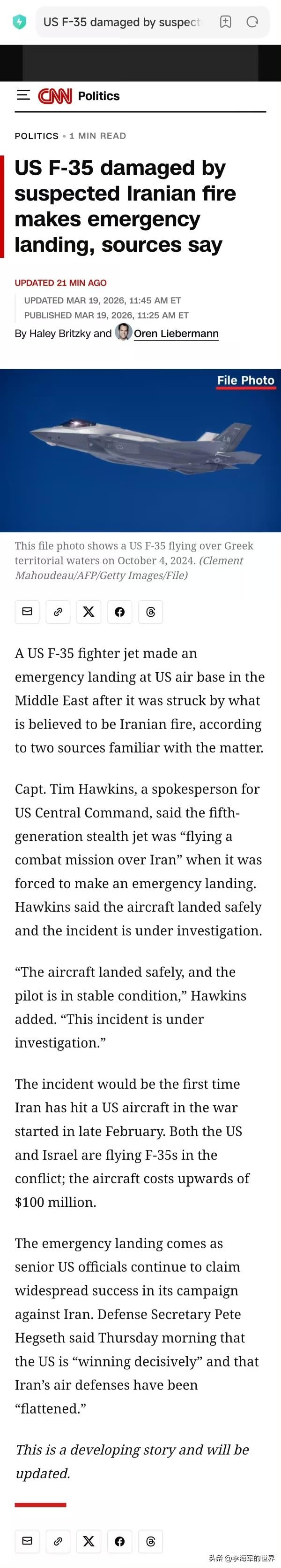 美军一架F-35战机疑似被伊朗击中。伊朗媒体发布视频,一架美军F-35战机被伊朗防空系统锁定,该机当时正飞行在伊朗中部地区。 美国中央司令部发言人蒂姆·霍金斯上尉表示,这架第五代隐形战机当时“正在伊朗上空执行作战任务”,随后被迫实施紧急降落。他称飞机已安全着陆,飞行员也安全,相关事件正在调查中。 如果情况属实,这将是自开打以来,伊朗首次击中美军飞机。还是F-35这种隐身飞机。 真的可能性很大。 CNN也报道了此事,看来是真的了。 这架F-35战机很可能先是被伊朗的米波反隐身雷达捕捉到,然后发射防空导弹+光电追踪系统锁定打击。光电系统锁定,这个距离相当近,也就几十公里。 美国F-35隐身战机神话破灭了。 老美这下亏大了,本想露脸了,结果把屁股露出了! 这次伊朗战争,美国军事神话完全被打破。 更糟的是美国的政治形象也完全破灭。 美军基地,不但保护不了所在国,反而是让所在国保护他。 花高价请的保镖,结果遇事保镖不但不上场,而是第一时间拔腿跑路,不光跑路,还让雇主保护他和装备。 花钱给自己雇了个大爷。