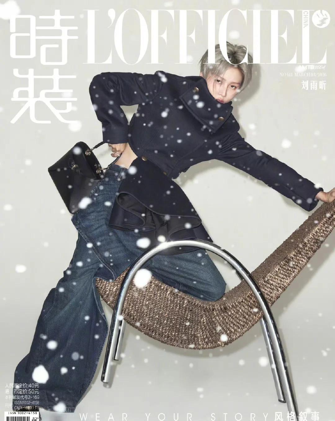 六登《时装》,首登银十,二度坐镇开季,同时还包含一次闭年刊: 2020年十月刊(银十) 2022年三月刊(开季) 2023年六月刊 2024年十二月刊(闭年) 2026年三月刊(开季) 新加坡版 2025年四月刊(生日) 开季刊封面 迪奥全球品牌大使刘雨昕 刘雨昕