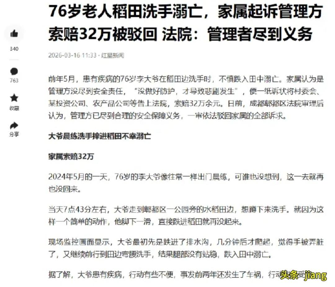 太离谱了!说出来没人敢信!四川成都,76岁的李大爷晨练,没招谁没惹谁,掉进了排水沟,爬起来又栽进稻田,最后不幸溺亡。家属悲痛之下,直接索赔321500元,把投资公司、农产品公司、村委会三家告上法庭,本以为家属能讨个说法,结局却大反转,法院直接驳回所有诉求,一分不赔! 法院驳回诉求,一分不赔。这个判决结果一出,网友们一片哗然。 有人心疼:好好一条人命没了,家属要几十万不过分吧?也有人愤怒:自己不小心出事,凭什么要别人买单?更有人直言:这一次,法院判得太解气! 很多人只看到悲剧,却没看清真相。事发当天,李大爷像往常一样出门晨练,路上不慎失足滑进路边排水沟。他自己爬了起来,本已脱离危险,可他没有选择回家休息、联系家人,反而继续往前走,不慎再次滑倒,落入一旁的稻田里。 更关键的是,这片稻田水深只有80厘米。 一个正常成年人,站在水里顶多到大腿,只要站稳、起身,完全可以自救。可因为年事已高、身体不稳,加上突发意外慌乱之下,李大爷没能起身,最终不幸溺亡。一条生命逝去,谁都惋惜。家属悲痛欲绝的心情,所有人都能理解。 但理解,不等于可以乱追责、乱索赔。 家属认为:路边没有护栏、稻田没有围挡、没人及时救援,三家单位都有责任,于是张口索赔32万多。可法院调查后,还原了全部事实: 第一,农产品公司早已在田间设置安全警示标识,定期巡查,尽到了管理义务;第二,稻田是农业用地,不是游乐场所,法律没有要求必须全封闭、装护栏;第三,排水沟、稻田都在公共区域之外,并非行人必经之路;第四,李大爷是完全民事行为能力人,明知年事已高、行动不便,仍独自外出,对自身安全未尽到注意义务。 法律讲证据,讲因果,不讲“谁死谁有理”,更不纵容“悲情绑架”。 法院最终认定:老人溺亡,是自身意外导致,与三家被告没有直接法律因果关系,驳回全部诉讼请求。 消息一出,全网点赞。 过去很长一段时间,不少人陷入一个误区:只要出事,就要找人背锅;只要受伤,就要找人赔钱。走路摔倒怪路面不平,爬树摔伤怪树木没警示牌,下河游泳溺亡怪河道没围挡……仿佛只要够可怜、够悲痛,全世界都要为自己的疏忽买单。 可公平的底线是:自己的责任,不能转嫁给别人。 同情不能凌驾法律,弱势不能代表正义。 老人离世是悲剧,但悲剧不等于可以无理索赔。家属的悲伤值得体谅,但把意外强行算在他人头上,就是对责任的逃避,对公平的漠视。 这一纸判决,看似冰冷,实则最温暖。它守住了法治底线,告诉所有人: 该你担的责,没人替你扛;不该别人赔的钱,一分也别想多要。 我们同情逝者,尊重家属,但更要尊重规则。年纪大不是免责金牌,悲痛不是索赔理由,意外更不能成为“漫天要价”的借口。 真正的安全,从来不是靠别人把你全方位保护起来,而是自己对生命心存敬畏,家人对老人尽心照看。 与其出事之后忙着追责、索赔,不如平日里多一份谨慎、多一份陪伴,少一点侥幸,少一点疏忽。 这一次,法院不和稀泥、不搞折中赔偿,用公正给所有人上了一课:法律保护善良,但绝不纵容巨婴;法律体谅悲情,但绝不绑架公平。 也希望每一个人都能记住:生命只有一次,对自己负责,才是对家人最好的交代。 大家觉得,这32万该不该赔?法院判得对吗?评论区说说你的看法。76岁老人晨练意外溺亡 老人意外家属索赔32万