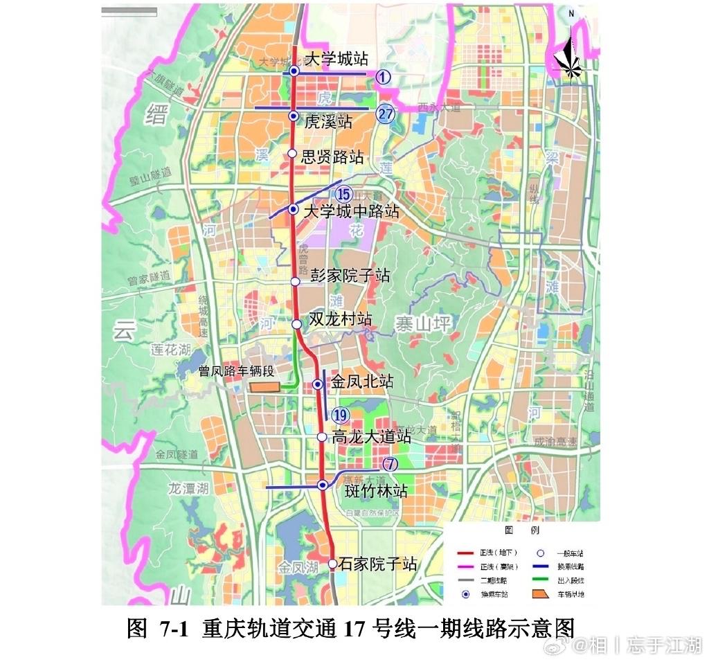 重庆轨道交通17号线 重庆轨道交通17号线一期预计于2027年建成通车,线路北起大学城站,南至石家院子站,全长约14公里,共设10座全地下车站,是重庆西部槽谷南北向的骨干客运走廊,将构建高新区至中心城区的“30分钟通勤圈”。 该线路串联大学城、曾家、金凤等重点片区,填补了区域轨道交通服务空白,未来可与多条线路便捷换乘。 大学城站与既有1号线换乘;虎溪站与在建27号线换乘;大学城中路站与在建15号线换乘;斑竹林站与在建7号线换乘;金凤北站规划与19号线换乘;石家院子站预留与市域快线C4线换乘条件。 等它建成,不管是去这些重点片区游玩,还是日常通勤,都会更轻松,重庆的轨道交通网也会更完善。