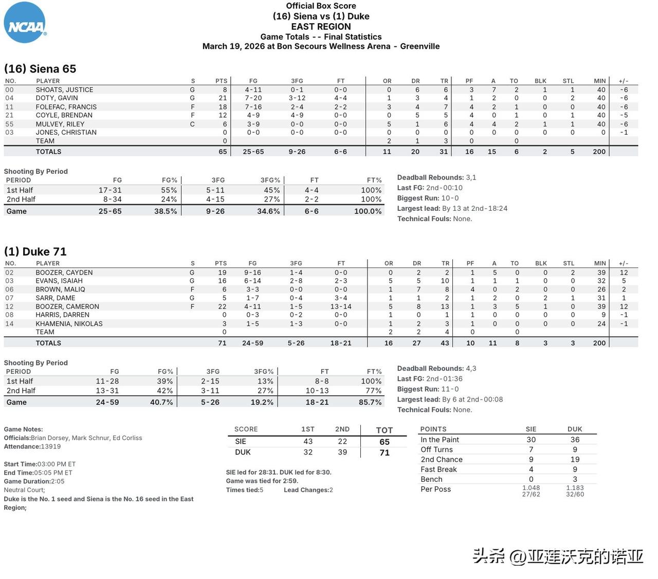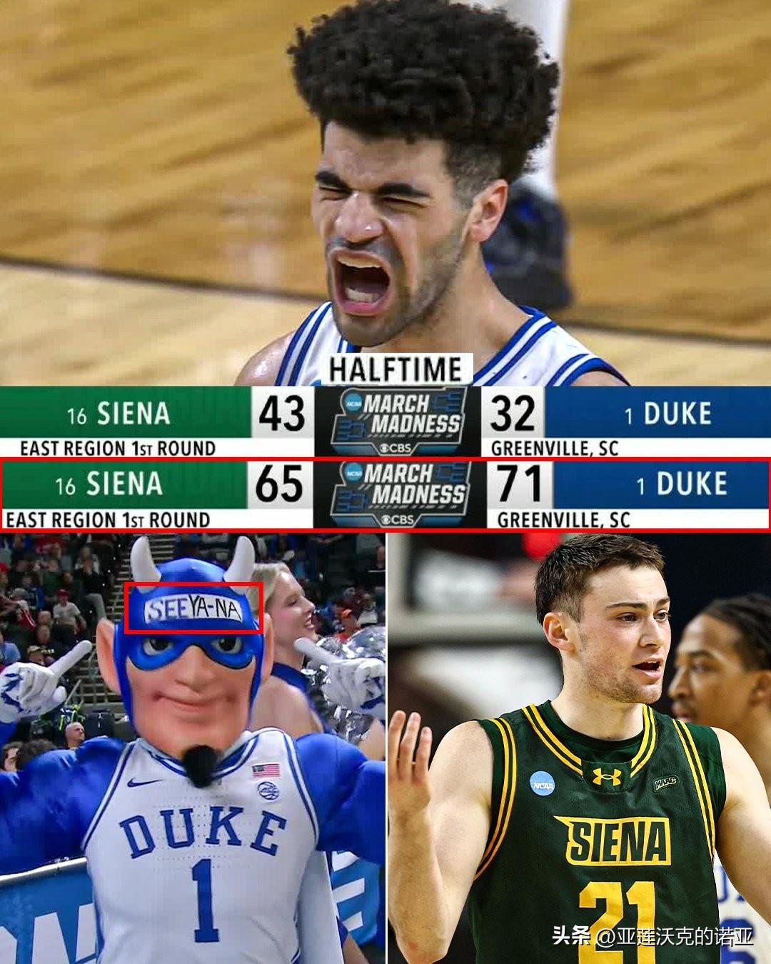 头号种子杜克大学差点被上演史诗级爆冷,对手Siena几乎只靠五位首发全力以赴,但最后阶段明显体力不足,蓝魔最多落后13分,本赛季从未落后这么久,Cayden Boozer单场19分5助攻是赢球关键,主帅Jon Scheyer为他感到骄傲,表示当情况最艰难时,正是凯登发挥最佳的时候。