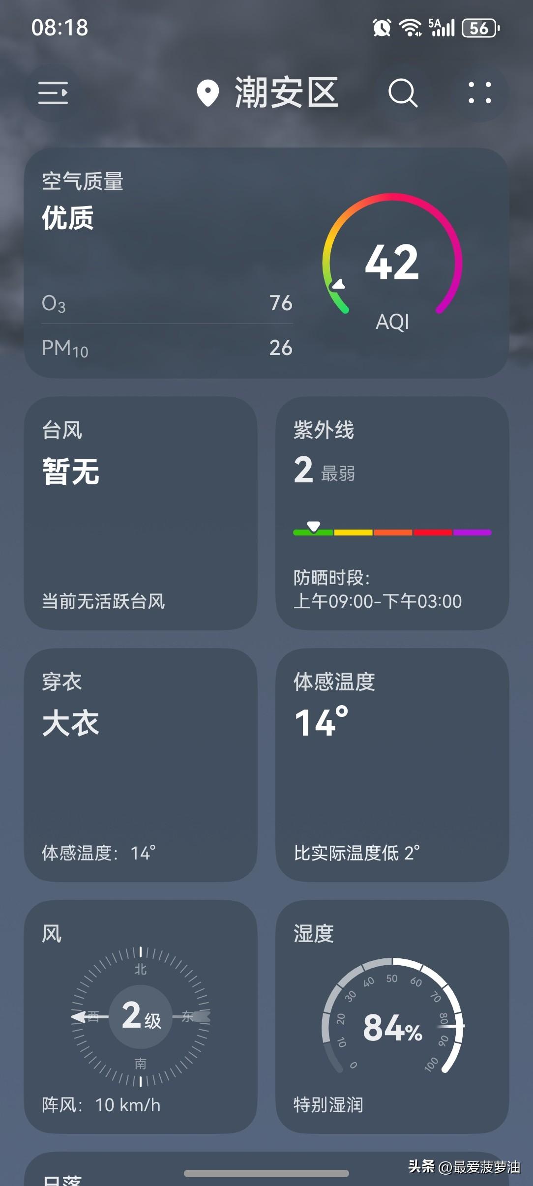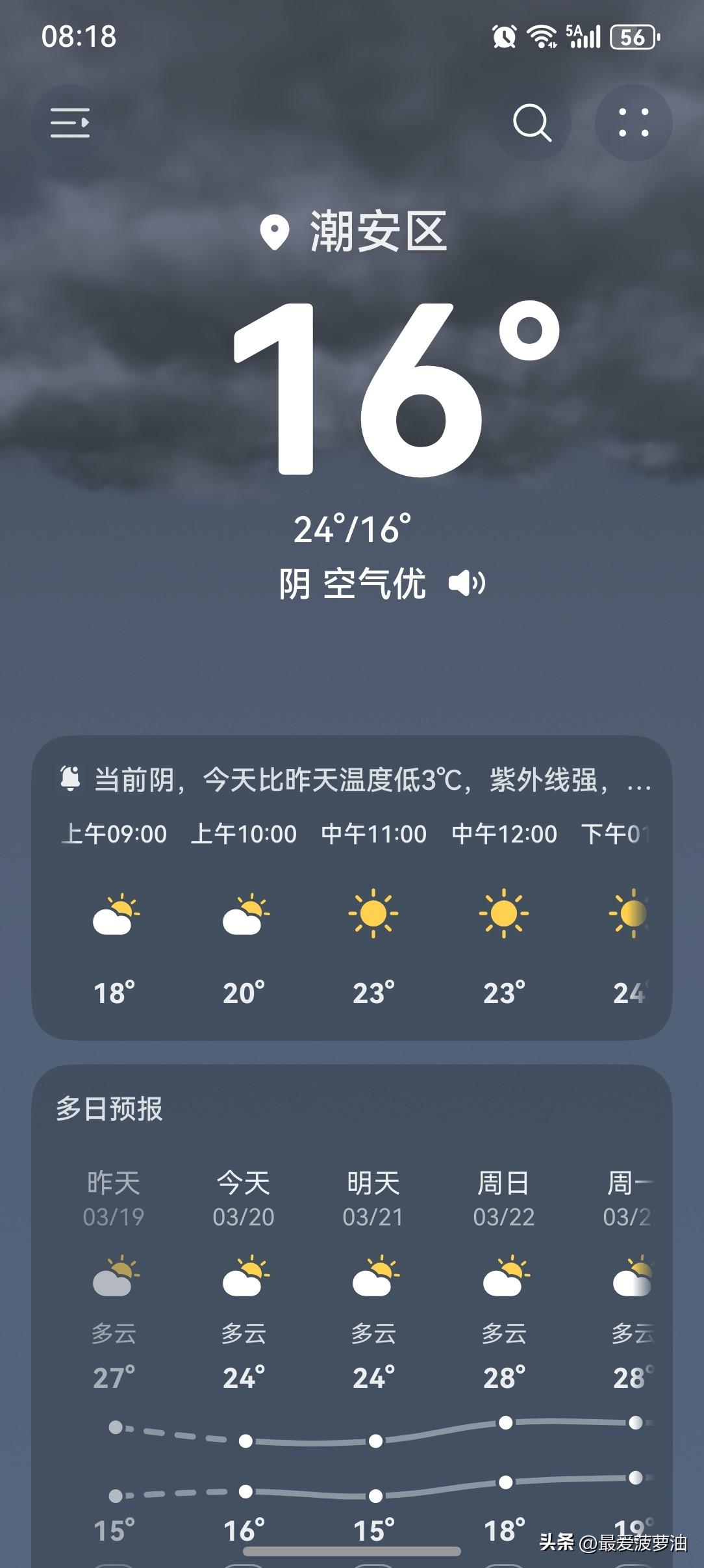 受云量或降水影响,广东气温小幅波动! 20~21日,粤北和珠江三角洲北部市县云量增多,其中韶关、清远、肇庆和河源北部市县,有小雨或分散小雨;22日大部市县可见光,早晚有轻雾。 今天(20日)潮州喜提一个多云天气,气温16~24℃,此刻气温16℃,体感温度14℃。 从昨天下午开始又刮起了大风,气温逐渐下降。今天早上起来发现,大风还在继续刮着。早晨的大风一吹,体感更凉,甚至感到有点冷了。 一起来看看今天的天空吧!今天的天气画风与昨天相差甚远,云量增多,见不到一点阳光。 从整体来讲,今天的天气还是挺好的。虽然风有点大,阴天没有阳光,但是还好不冷,也没有下雨。总的来说,今天的天气还是值得好评的。 如此天气!元芳,你怎么看? [我想静静][笑哭][大笑][捂脸][我想静静][笑哭][大笑][捂脸]