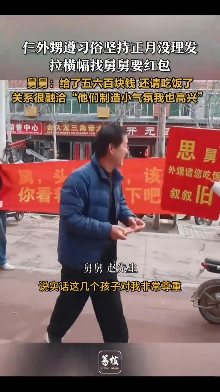 仁外甥遵习俗坚持正月没理发,拉横幅找舅舅要红包。舅舅:给了五六百块钱还请吃饭了,关系很融洽,他们制造小气氛我也高兴。 舅舅赵先生。 中国习俗正月当外甥的不能剪头,他们遵照这个习俗坚持了一个月,总共给了五六百块钱,加上晚上请他们吃饭。说实话这几个孩子对我非常尊重,所以他们制造了一个小气氛,我心里非常高兴。