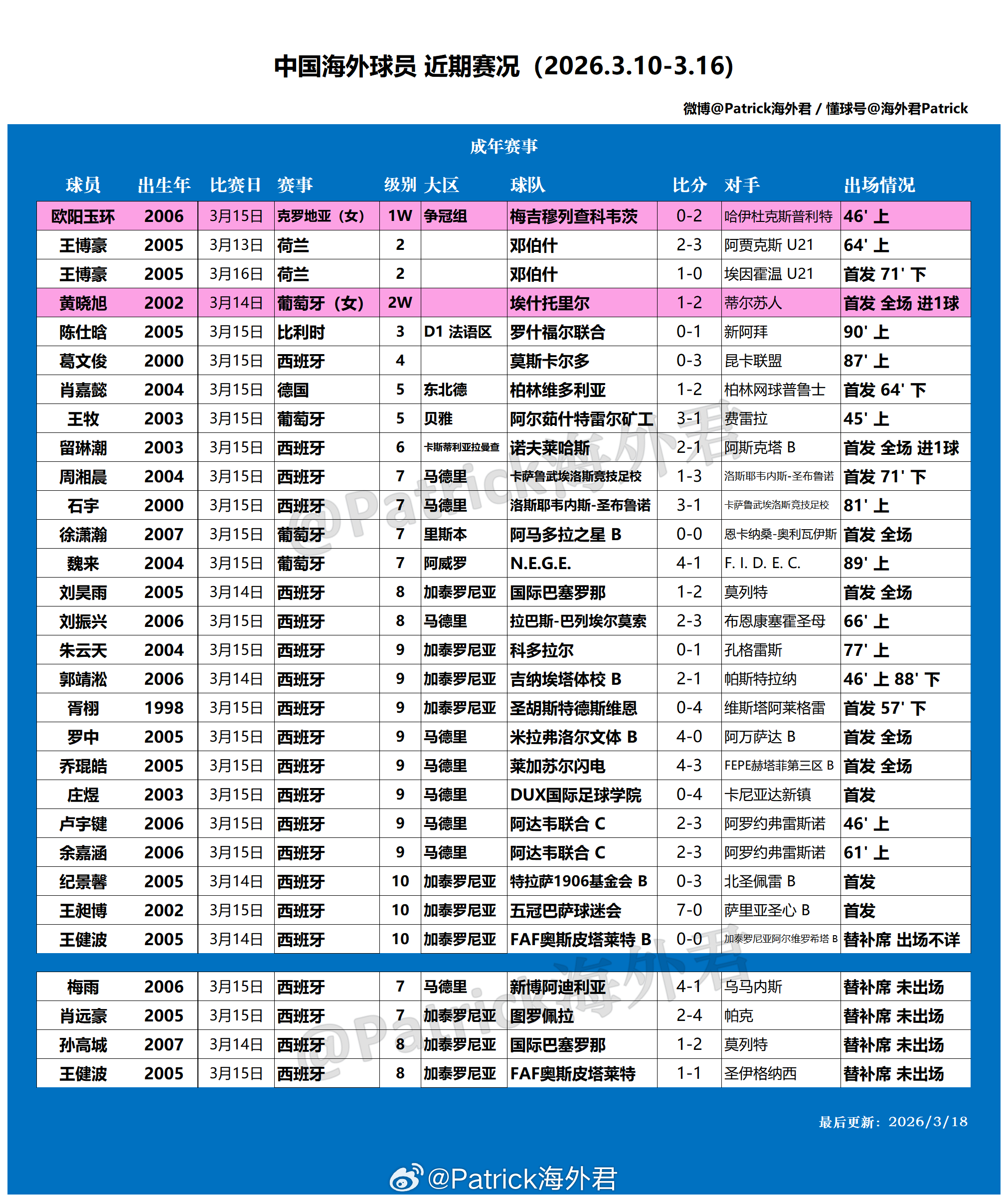 留洋周报 海外球员比赛一览 (2026年3月10日-3月16日)