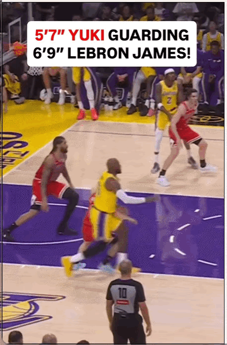 本赛季NBA联赛最大反差的防守对位照片出现了! 河村永辉身高170厘米,体重144斤; 勒布朗詹姆斯身高206厘米,体重226斤! 就在3月13日湖人队对阵公牛队的比赛中,河村永辉在篮下一对一单防詹姆斯的镜头火了! 当时詹姆斯在篮下准备向队友要球,河村永辉凭借灵活性紧紧贴住詹姆斯不让他接球。 詹姆斯身高比河村永辉高了36厘米, 体重比河村永辉重了82斤! 如此体重和身高差距之下,河村永辉硬是让詹姆斯无法接球! 詹姆斯比河村永辉高了实在太多了,河村永辉还没有老詹肩膀高,老詹想要和防守他的河村永辉对抗都发不上力! 镜头二是河村永辉在三分线之外迎着詹姆斯的防守投中三分的画面,说真的,现在詹姆斯的移动速度确实有明显下降,不然这一球绝对会是一个特别轻松的大帽……
