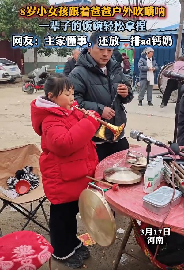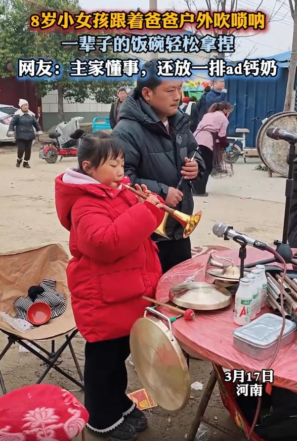 这可是一辈子的饭碗!河南,一名8岁小女孩跟着父亲一起去参加村里的白事,可她并不是来吃席的,而是跟着父亲一起吹唢呐的,轮到她吹时,音色洪亮,气息稳重,让不少人看的惊艳连连 视频中,小姑娘和爸爸并排站着,爸爸吹的时候,她就板着小脸在旁边候着,表情淡淡的。可轮到她上场,整个人精气神立马就变了,唢呐一响,底气十足,音也准,一看就是没少跟着父亲出来跑场子,这种场面见得多了,根本不怵 更逗的是主家的反应。一般大人来表演,可能递盒烟就算意思意思了,到了小姑娘这儿,人家直接给了一联AD钙奶 有网友看了说,小姑娘看着像被迫营业,脸上没什么笑模样 这话其实也不难理解,新鲜玩意儿吹一回两回是高兴,可要是让你吹上百回千回,当成任务来完成,换谁也难天天乐呵呵的。这么小的年纪,要说打心眼里爱上上班,那不太现实,更多是跟着父亲,把这当成生活的一部分在过 这也是很多民间手艺人的真实缩影。孩子从小在这样的环境里泡大,耳濡目染,手上自然就有了功夫。她不一定现在就明白这门手艺的分量,但等她长大就会知道,这不是什么兴趣班学来的花架子,是能安身立命的真本事 生活有时候就是这样,看似是早早扛了担子,其实是在给自己攒一辈子的底气。小姑娘现在可能更惦记那联AD钙奶,但等她将来站在更多场合,吹起唢呐依然底气十足的时候,就会明白今天这些跟着父亲走过的村子、见过的场面,都是根。这饭碗看着不起眼,可确实能端一辈子