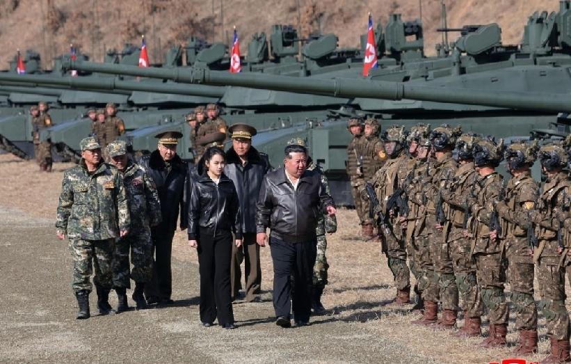 朝鲜领袖金正恩周四(19日)到访朝鲜人民军首都防御军直属平壤第60训练基地,视察步兵和坦克兵部队协同攻击战术演习,期间与爱女金主爱同坐坦克。 金正恩称,新型主战坦克核心技术开发耗时7年,其战斗性能优越,今后新型坦克将大量装备至朝鲜陆军,朝鲜的装甲武力将发展到更高阶段。