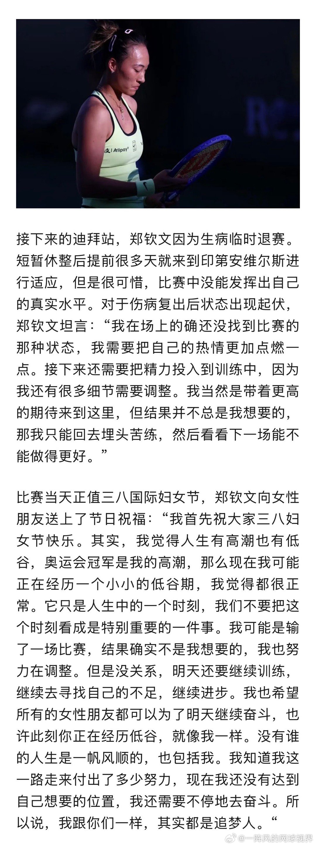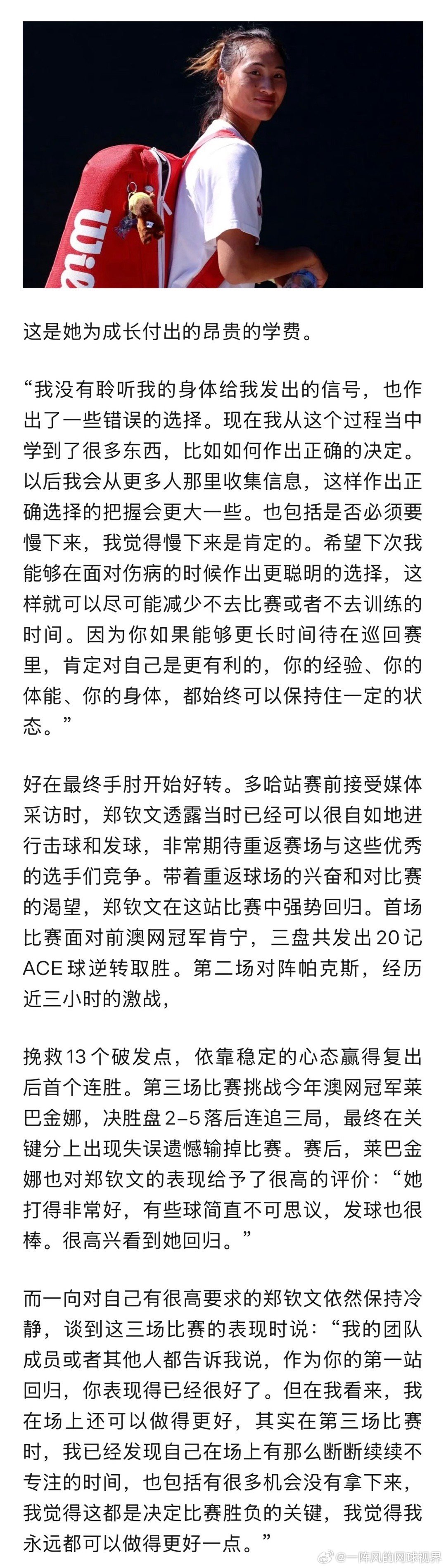 明天2号球场第4场比赛,郑钦文在迈阿密的首场比赛将对阵斯蒂芬斯。正好给杂志写的稿子发公众号了,杂志要等到下个月才出,就用这篇稿子给小郑加油吧。郑钦文郑钦文vs斯蒂文斯郑钦文首秀对手确定©️版权图片,转载请署名