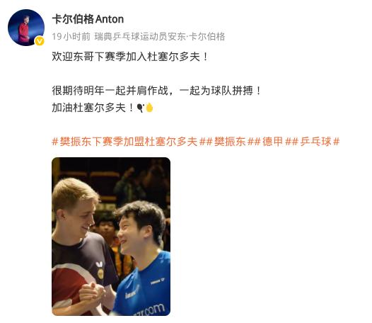 卡尔伯格发文欢迎樊振东, 暖心喊话并肩作战,握手合照太吸睛 19日,卡尔伯格正式发文,欢迎樊振东加盟杜塞尔多夫🔥 一句“东哥”,看得出来两人关系很融洽, 配文+握手照,简单却满是期待感! 卡尔伯格:欢迎东哥下赛季加入杜塞尔多夫! 很期待明年一起并肩作战,一起为球队拼搏! 最后还不忘为球队加油:加油杜塞尔多夫! 照片里两人双手紧握,画面特别有氛围感 要知道,下赛季两人就将成为队友,一起征战德甲赛场 没有多余的花哨表述,全是最真诚的期待 大家觉得, 樊振东和卡尔伯格搭档,能帮杜塞尔多夫再创佳绩吗? 评论区说说你的看法~