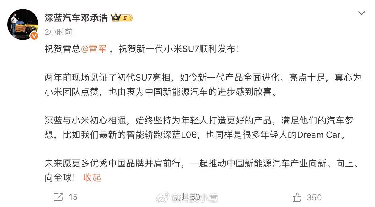 深蓝董事长祝贺小米SU7发布 这种氛围就很好呀~中国车企们互相携手共进,也会相互祝贺,这样众多企业开始并肩前行的样子,良性竞争合作共赢,咱们中国汽车行业肯定是欣欣向荣的!