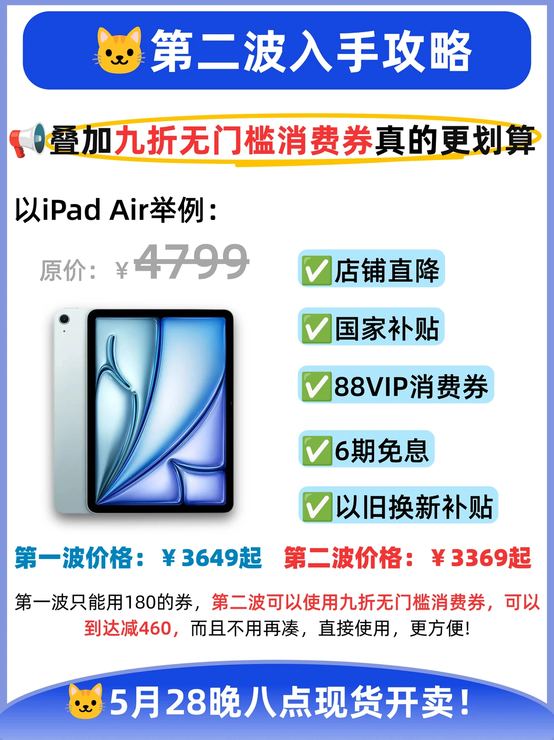 以iPadAir为例子,第一波时只能用180的券,第二波有88vip九折无门槛消费券,可以直接用460的券,直接省下一个苹果耳机