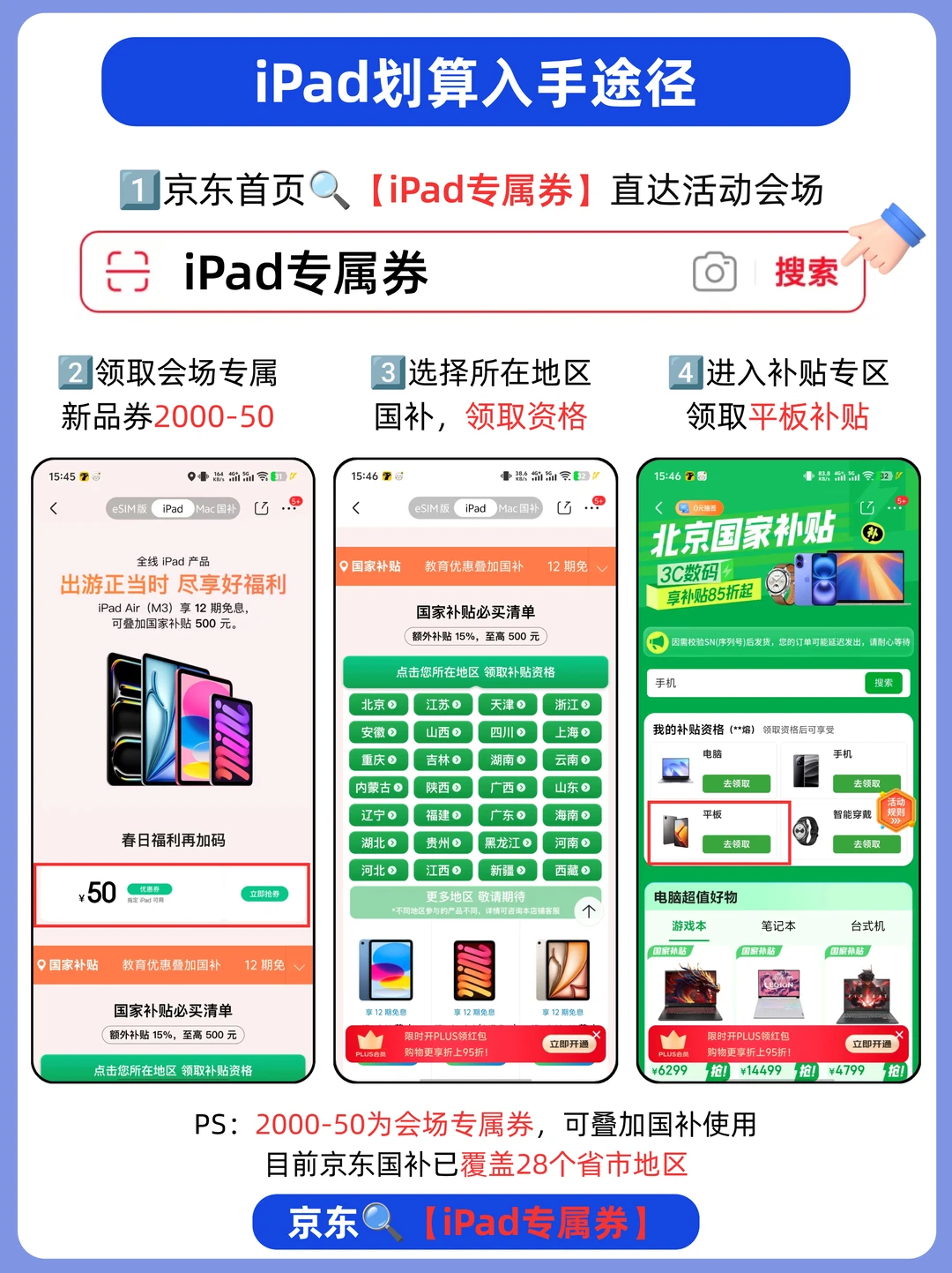 1⃣京东🔍【iPad专属券】,可直达会场,领取会场专属券2000-50,可叠加国补使用