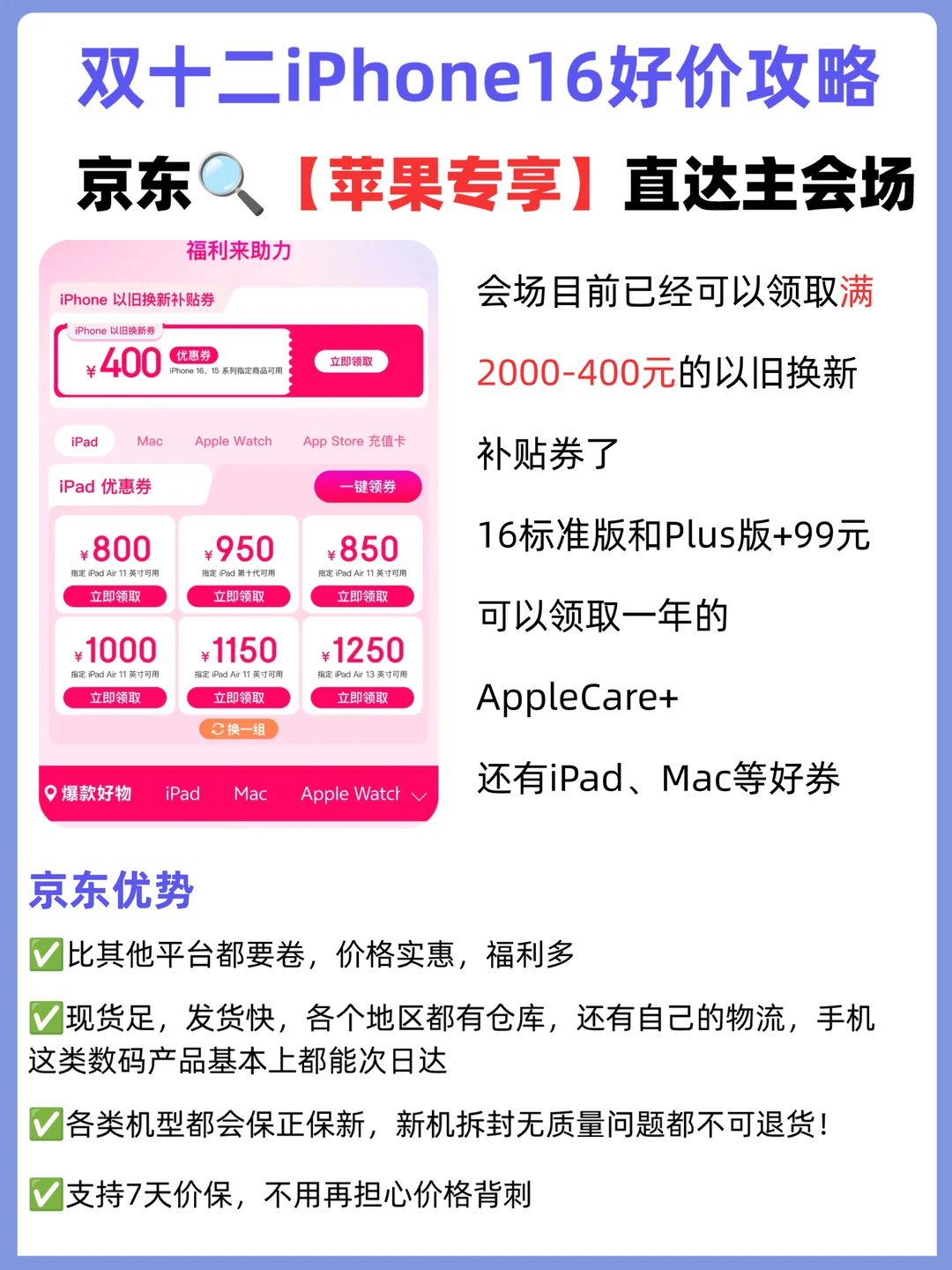 京东🔍【苹果专享】,可直达主会场,现在已经可以领取满2000-400的以旧换新补贴券,入手iPhone15和16系列都可以使用,现在入手16标准版和plus版+99元可得一年的AppleCare+